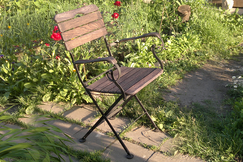 Складное кресло прекрасно подойдет для комфортного отдыха в саду. Каркас выполнен из металла, сиденье и спинка – из натуральной древесины. Подлокотники имеют деревянные накладки.