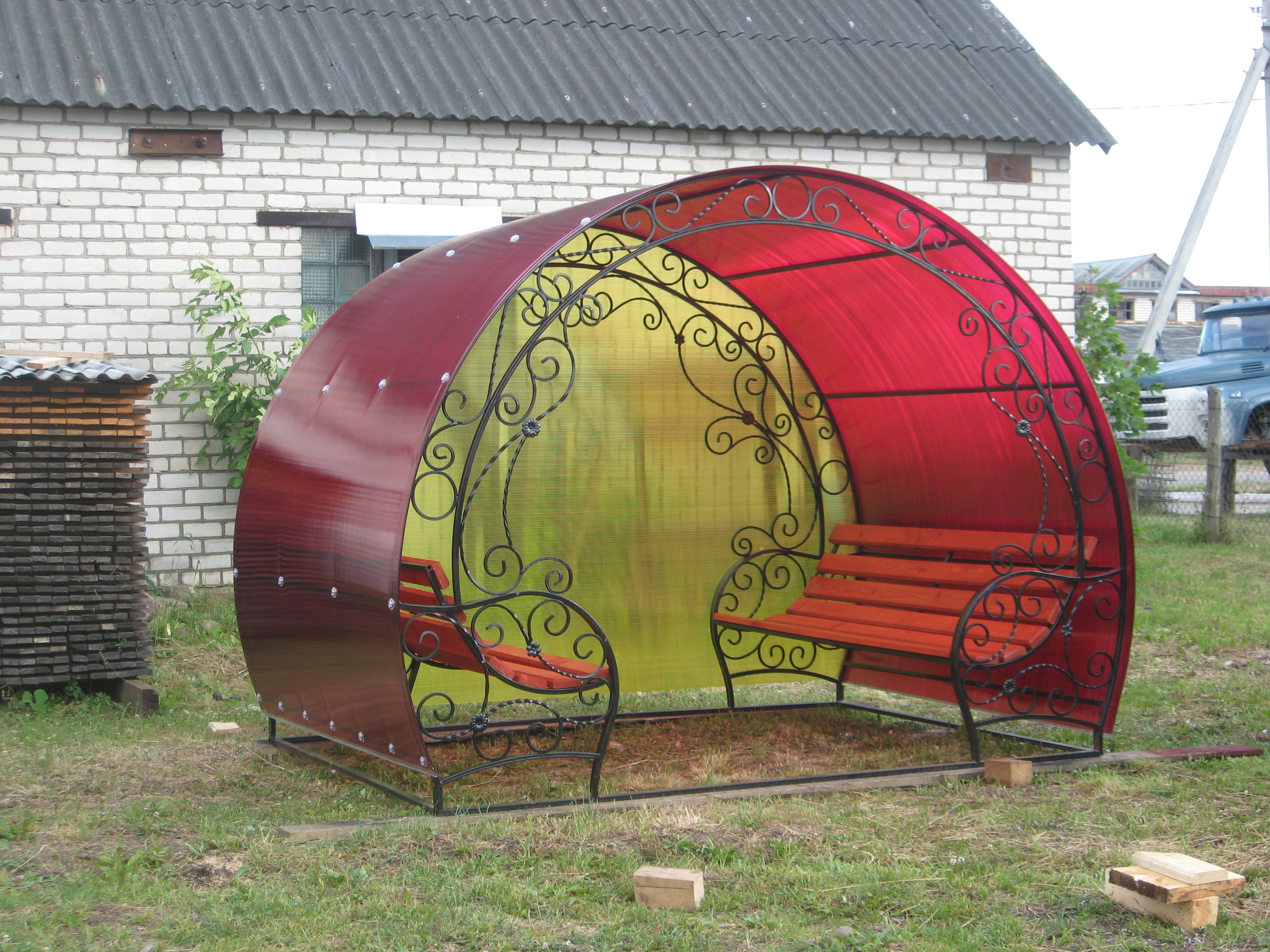 Легкий полукруглый каркас из ковки. Беседка в форме кокона или ракушки.