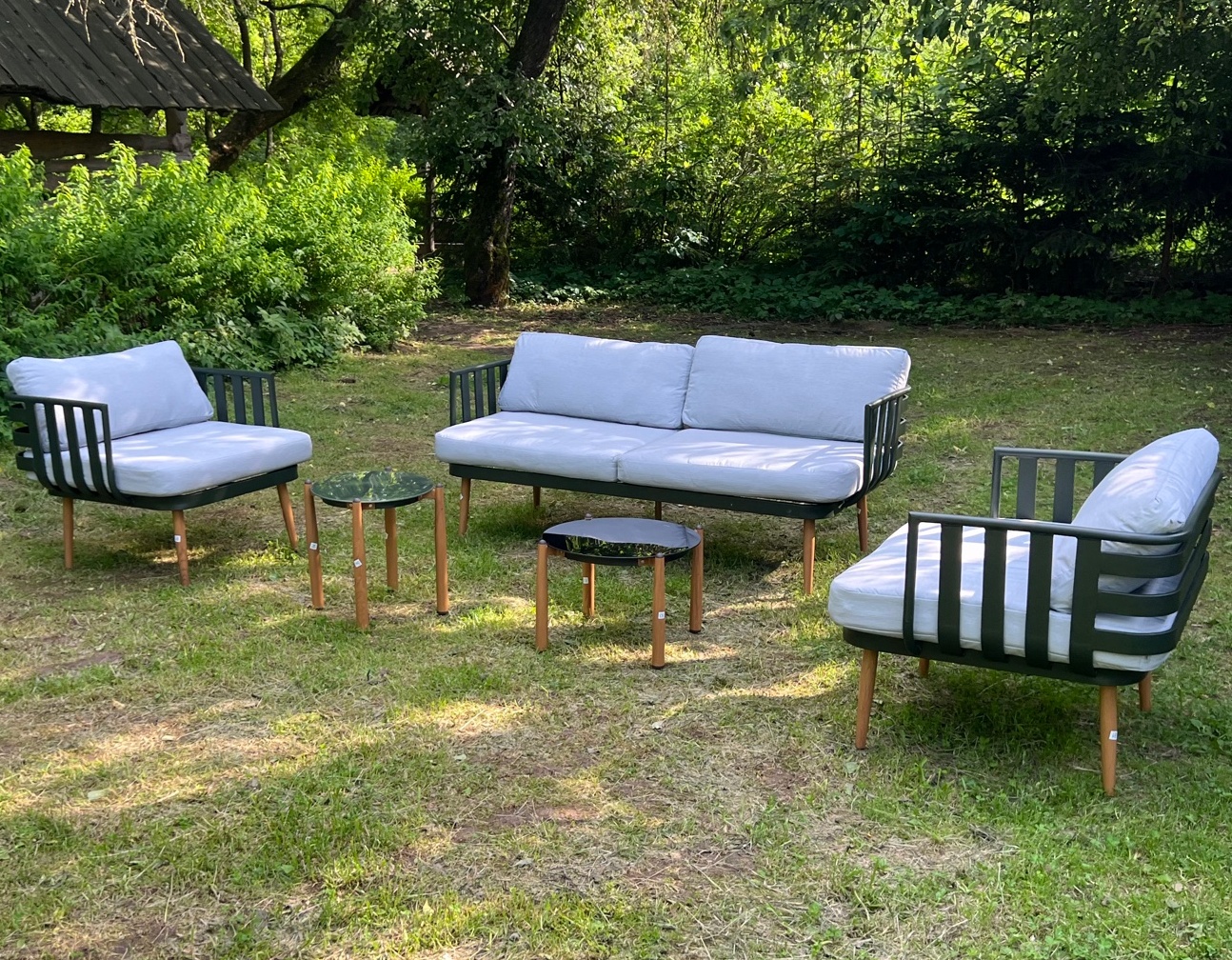В комплекте: трехместный диван, два кресла, столик. Материал каркаса: полипропилен