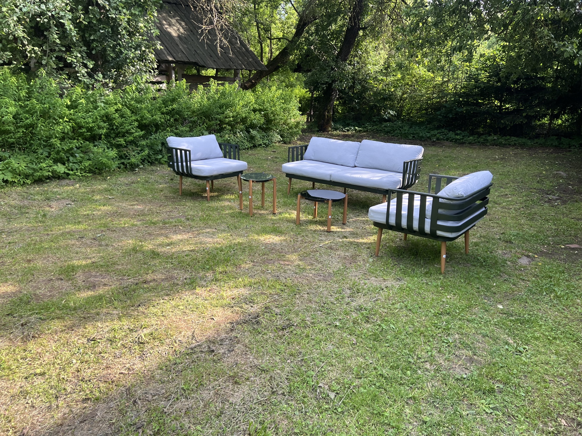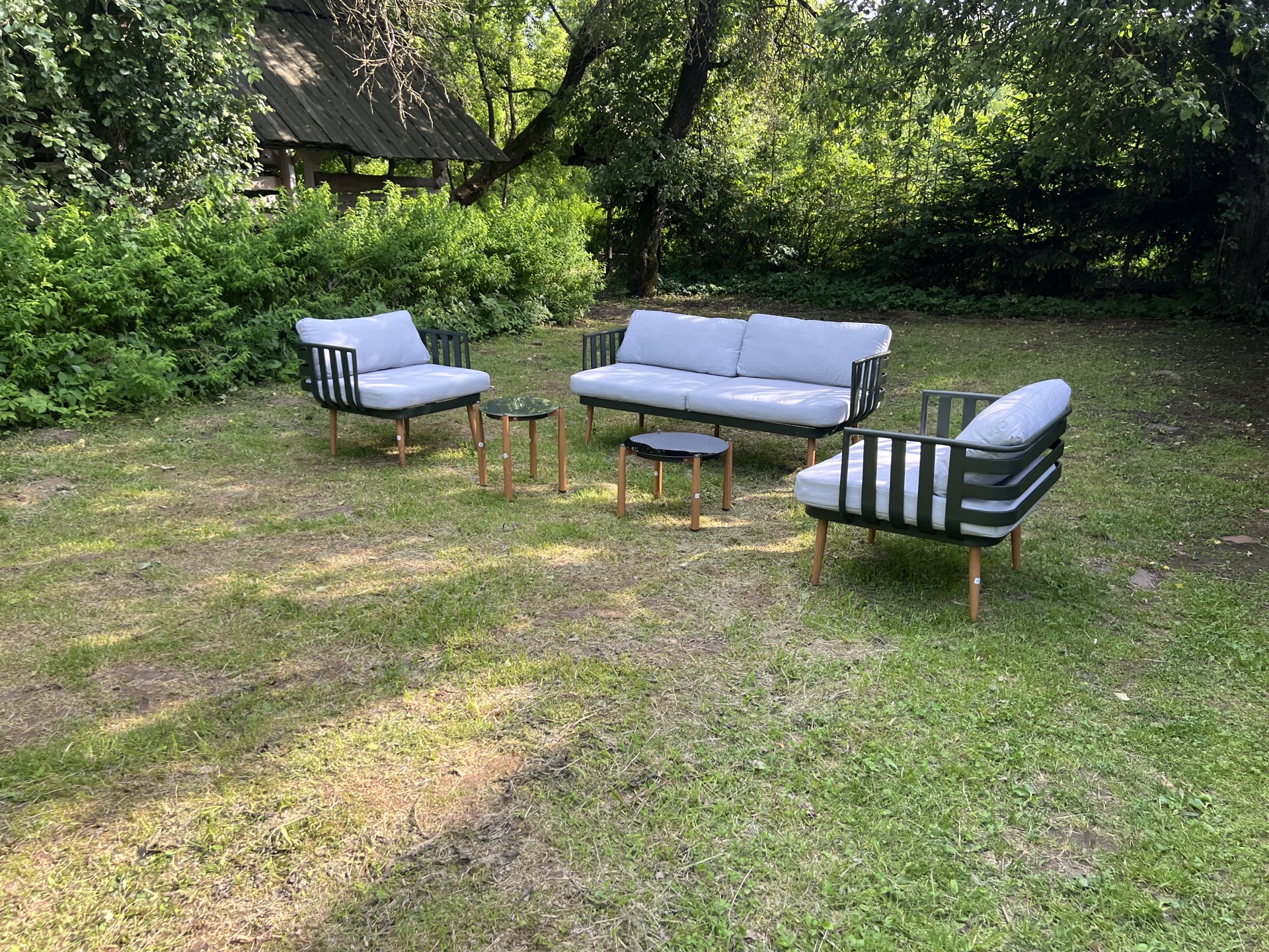 код 150453Комплектация: 2 столика, 2 кресла, диван. Материал, сталь, полиэстер.