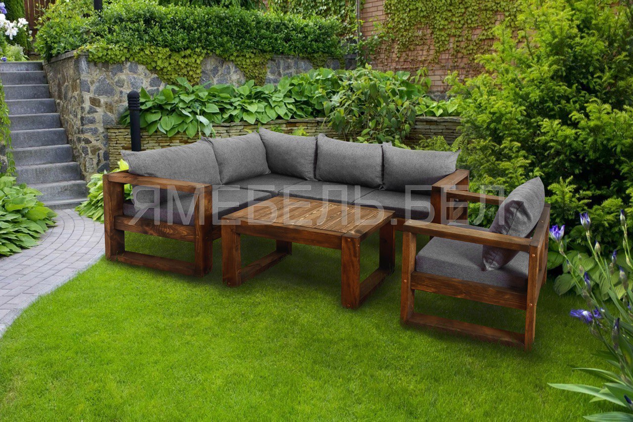 В наборе: диван угловой, крело, стол. Материал: массив сосны с влагоустойчивым лаком.