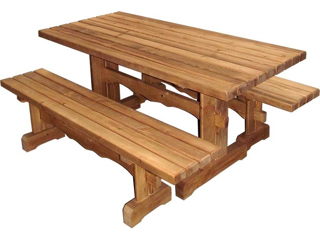 код 143380Состоит из стола и двух скамеек, изготовленных из массива сосны c отделкой мастикой на основе воска.