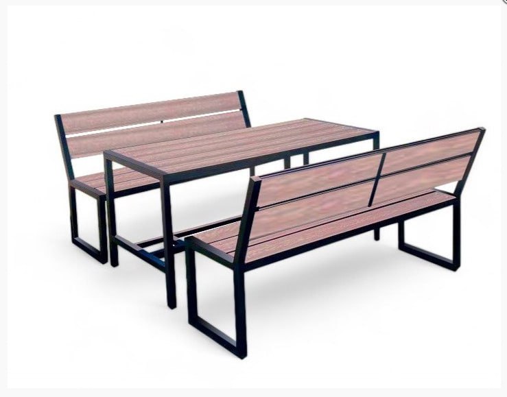 код 153588Комплектация: Стол, 2 скамьи. Материал: металл, ДПК доска.