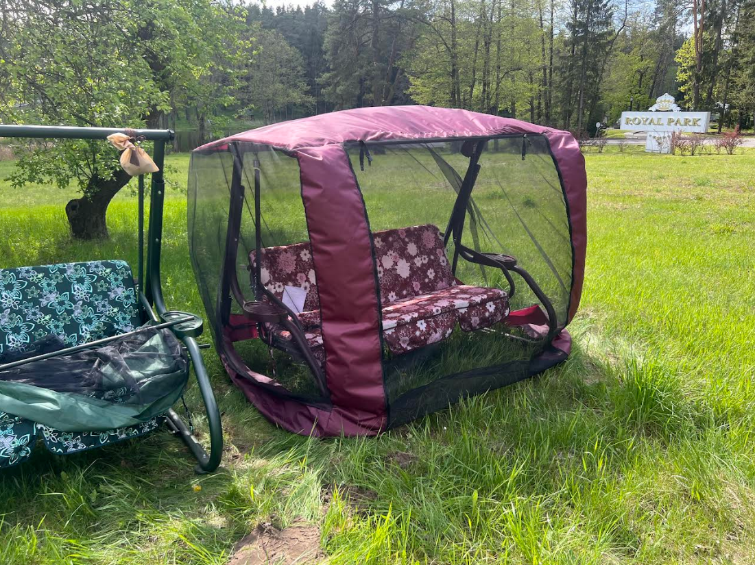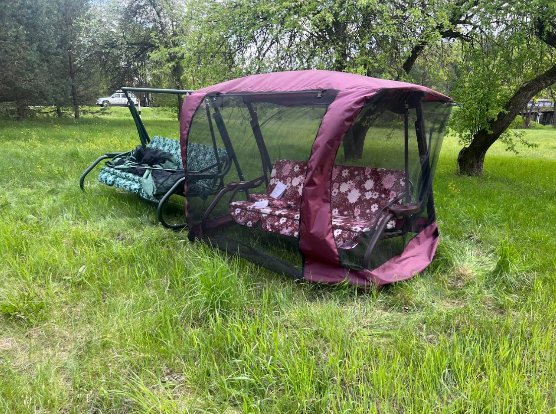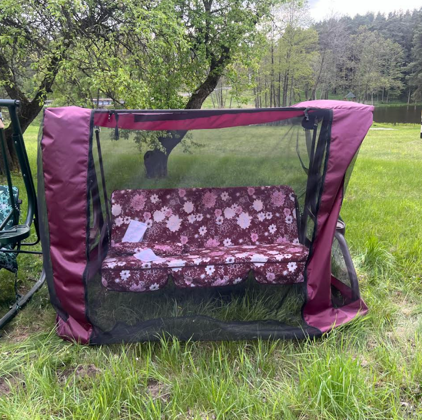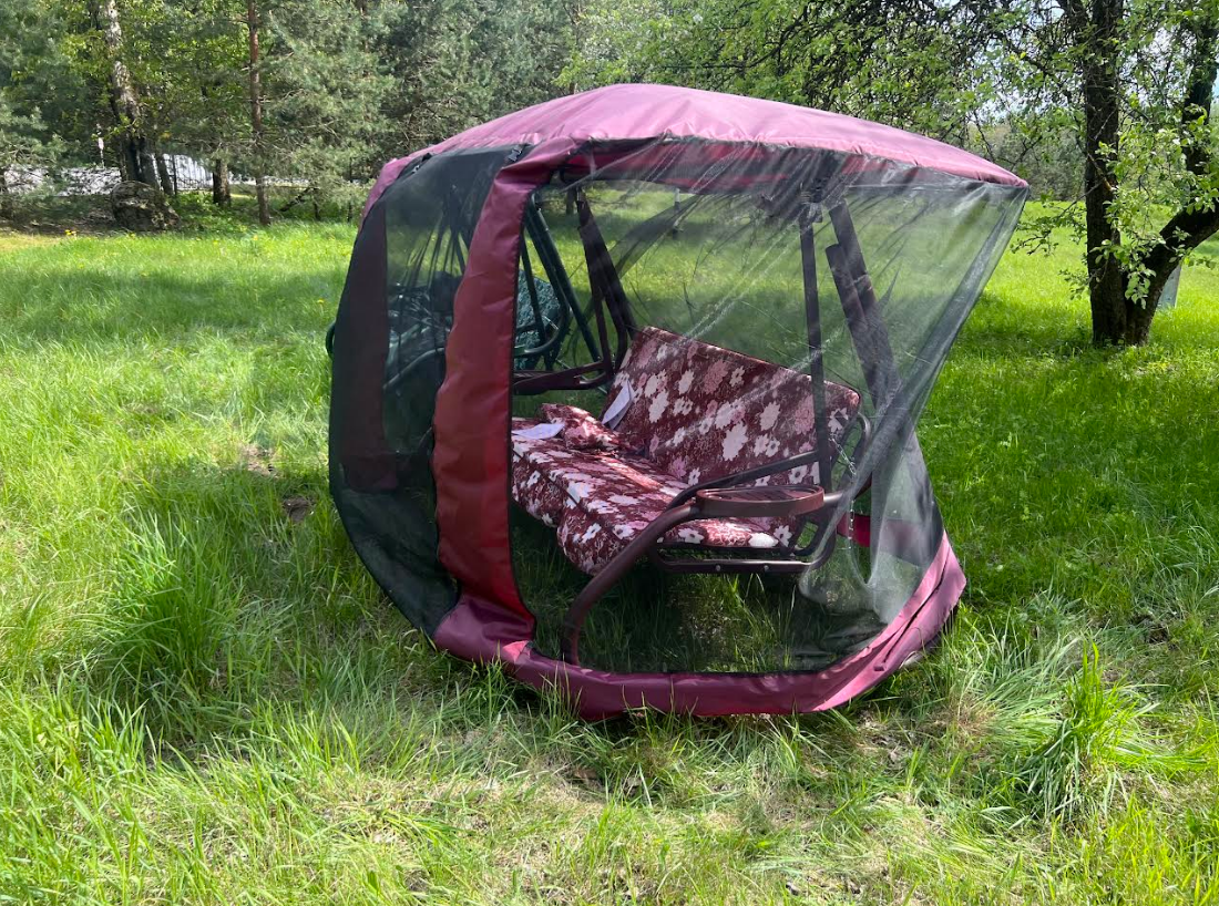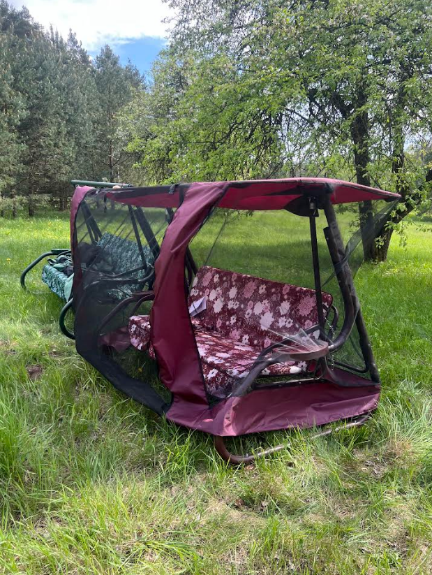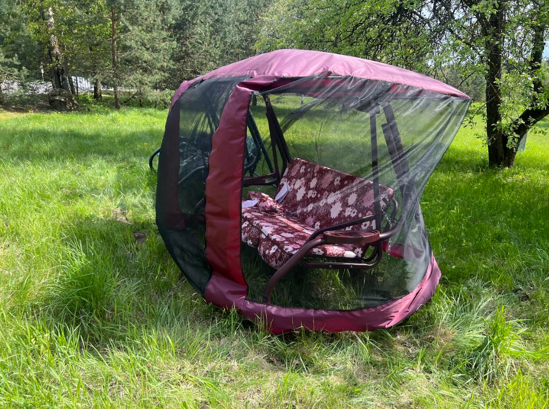Удобные садовые качели с мягким диваном и водоотталкивающим тентом.