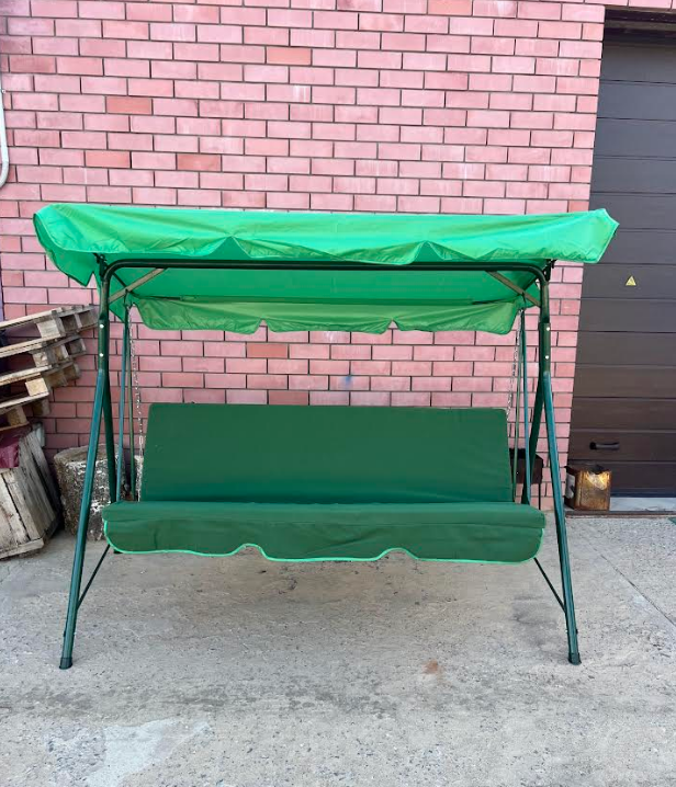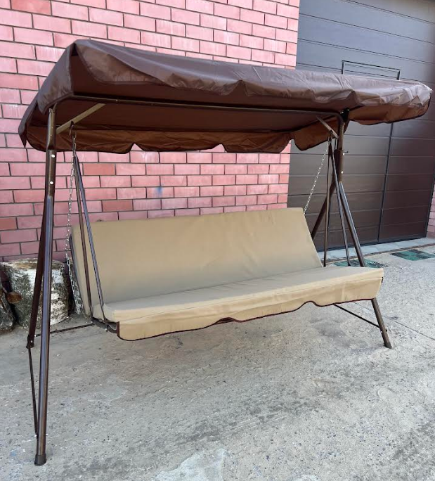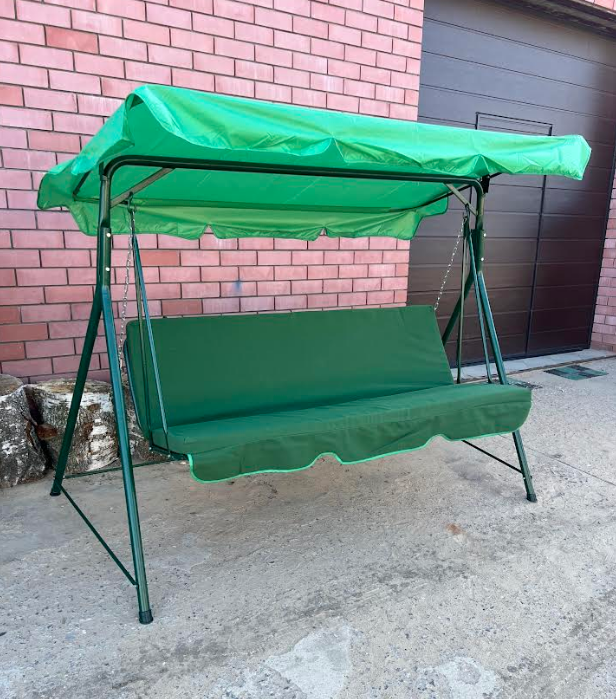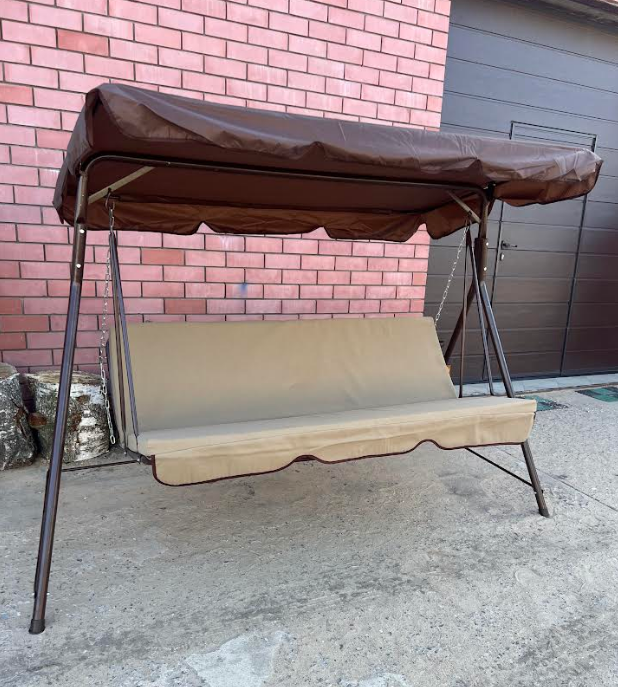 Удобные садовые качели с мягким диваном и водоотталкивающим тентом.