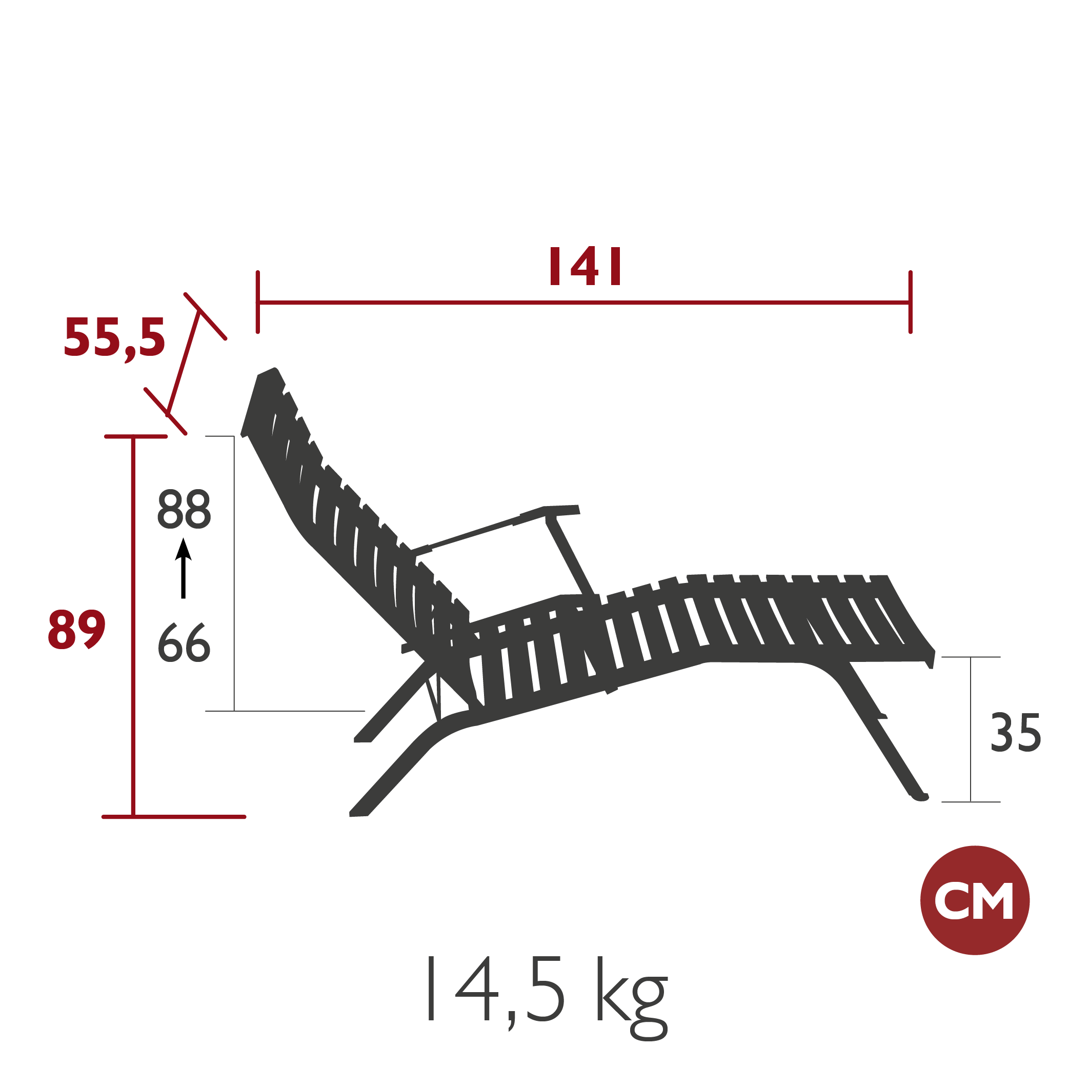 Рама шезлонга изготовлена из плоской стали, что обеспечивает его прочность и долговечность. Основание сиденья и спинка выполнены из гнутых стальных планок, что придаёт конструкции лёгкость и изящество. Подлокотники из стальных листов добавляют шезлонгу надёжности и удобства в использовании.