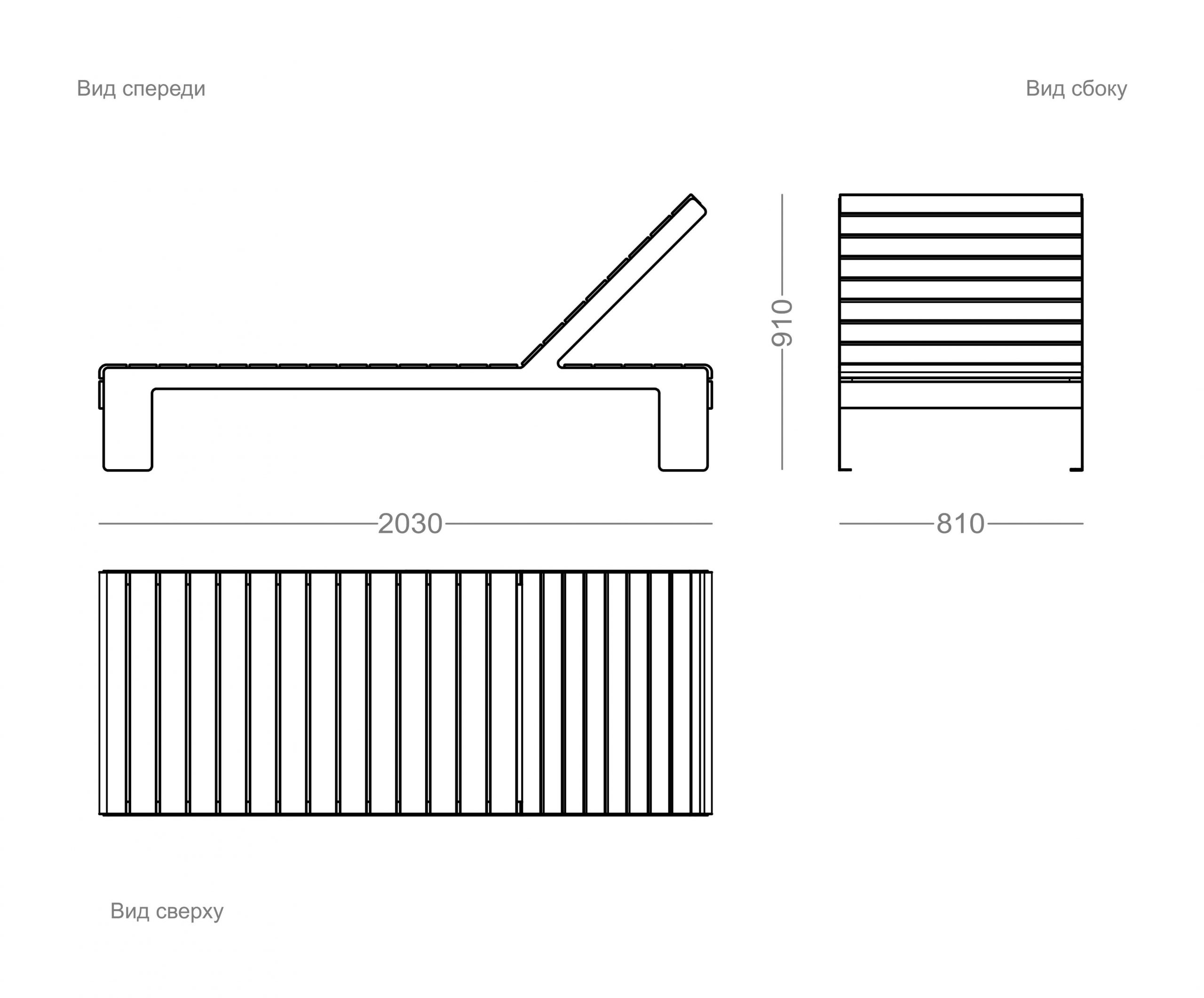 Размер (ШхВхГ): 70x195xh52 см. Каркас: алюминий, рама: алюминий, без подушки, 5 положений подголовника.