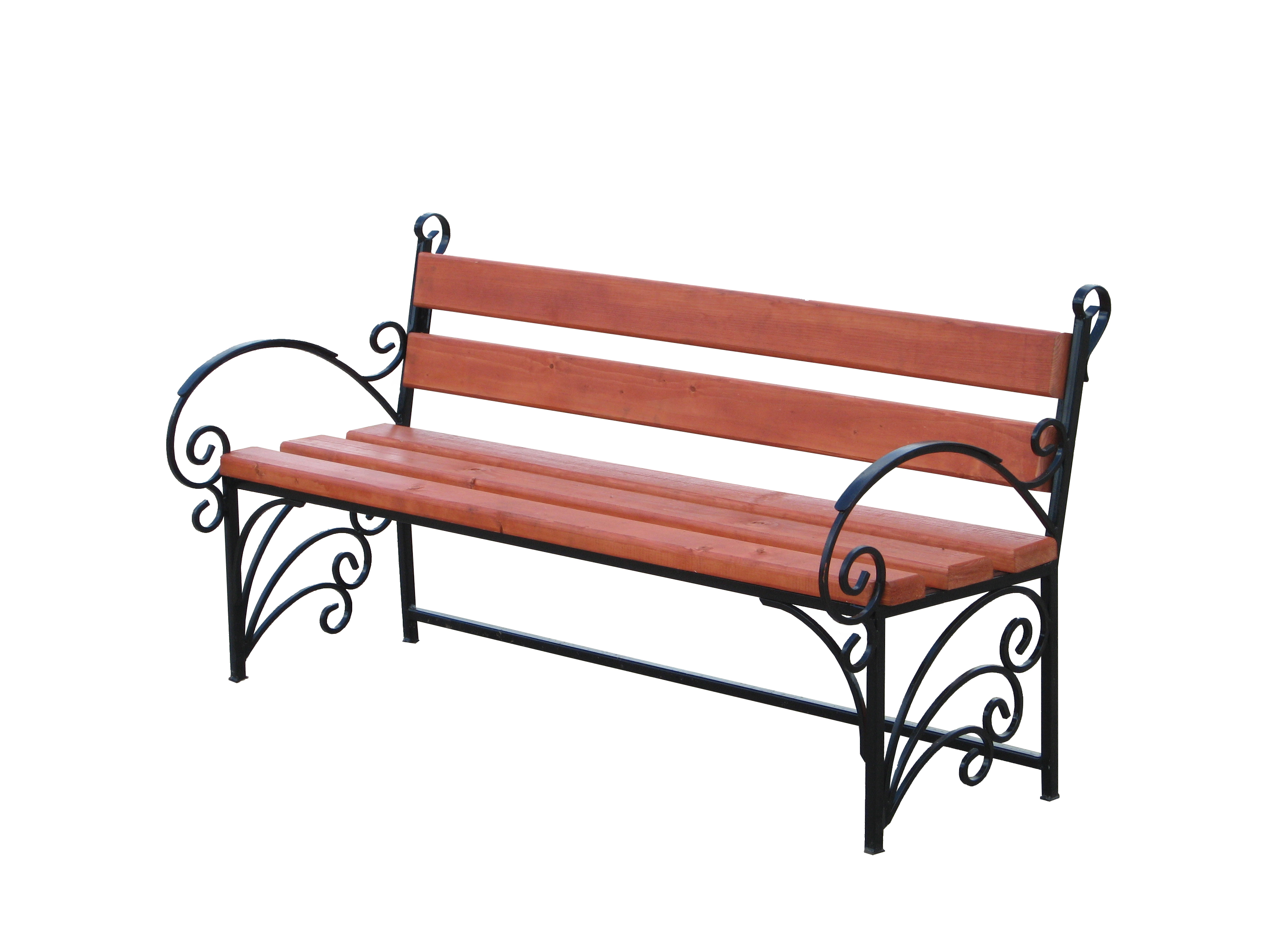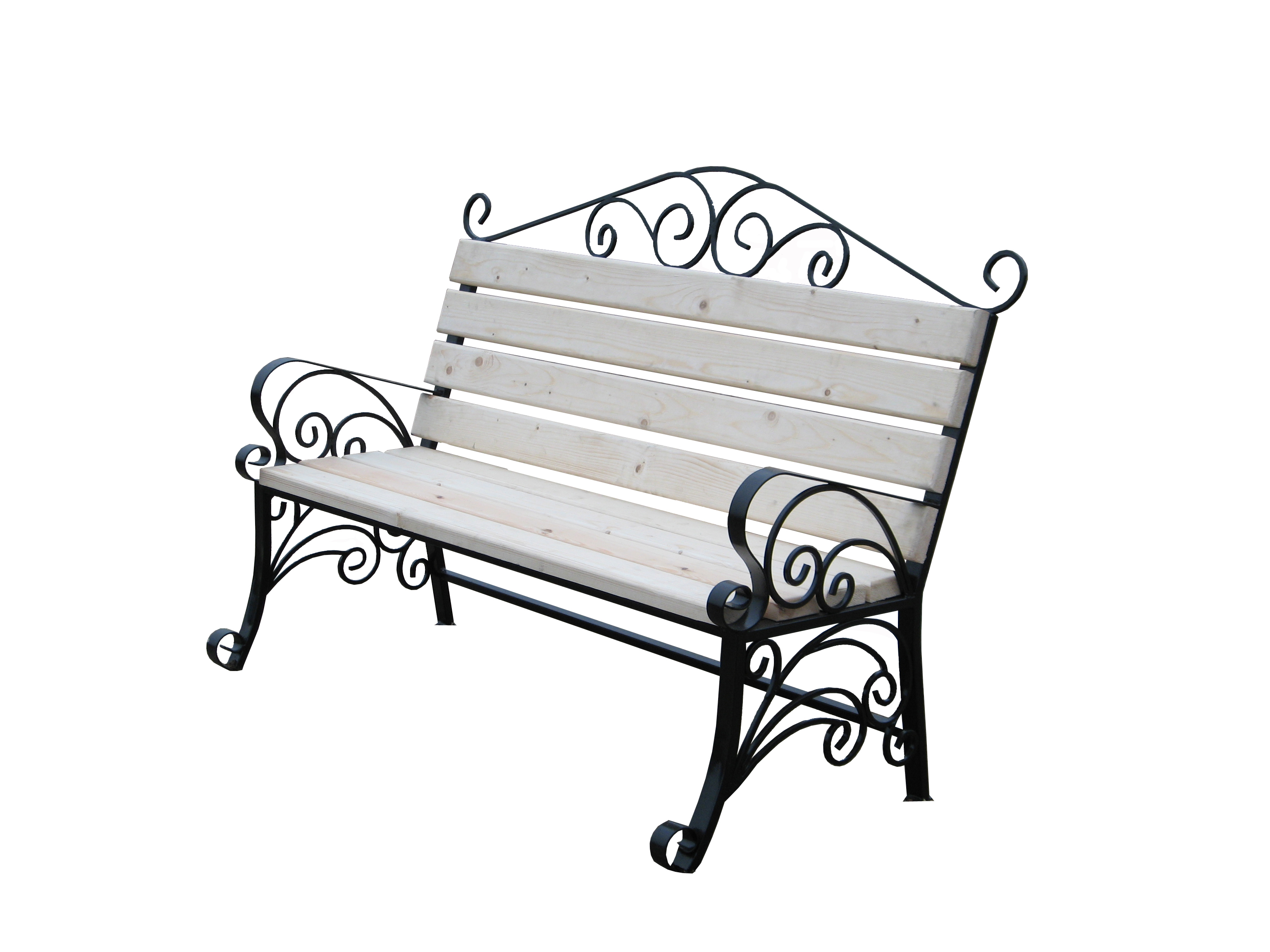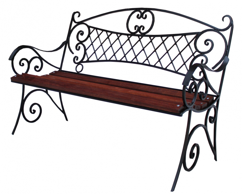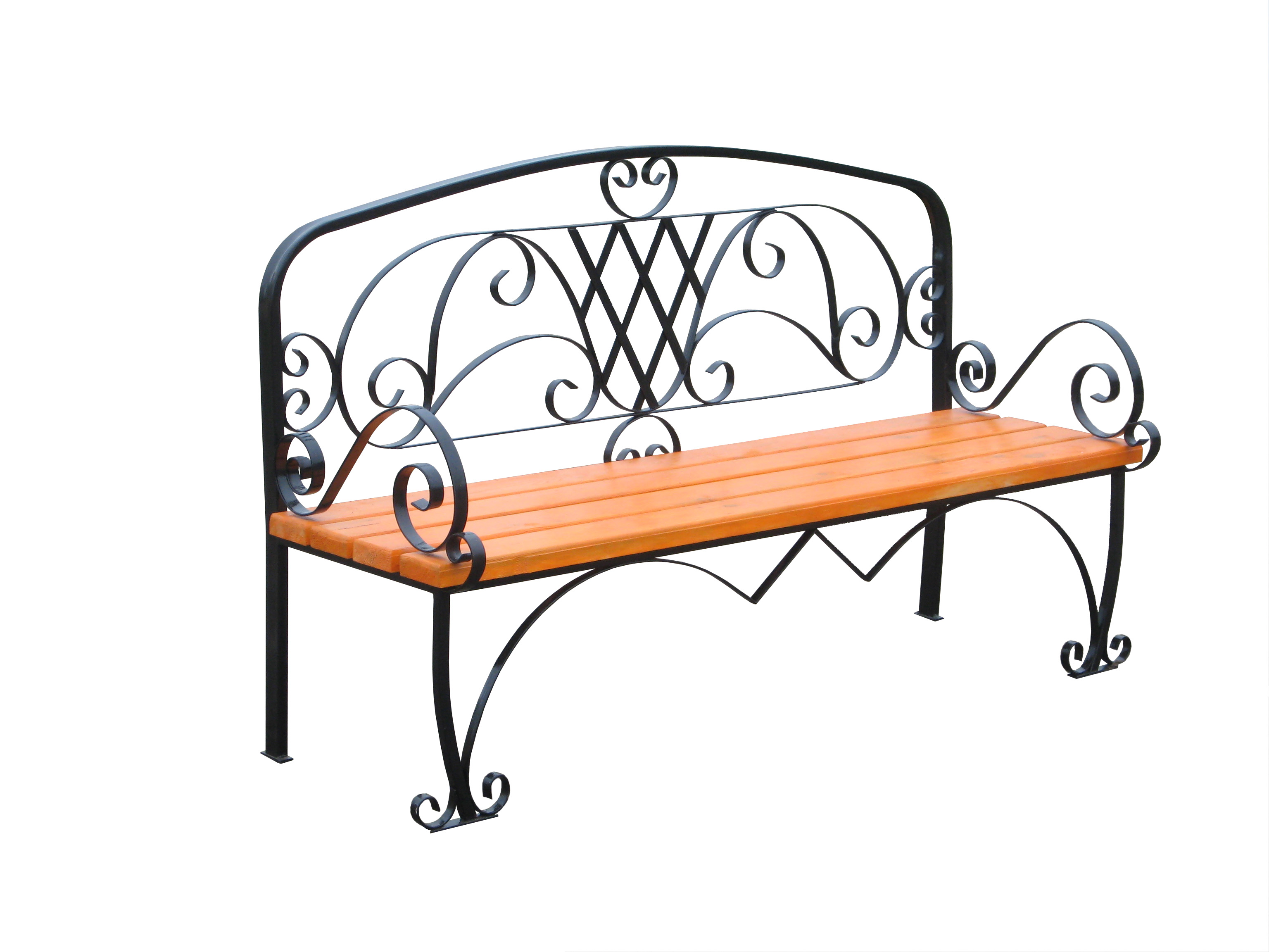 Спинка и сиденье отделаны деревянным брусом, украшены декоративной ковкой.