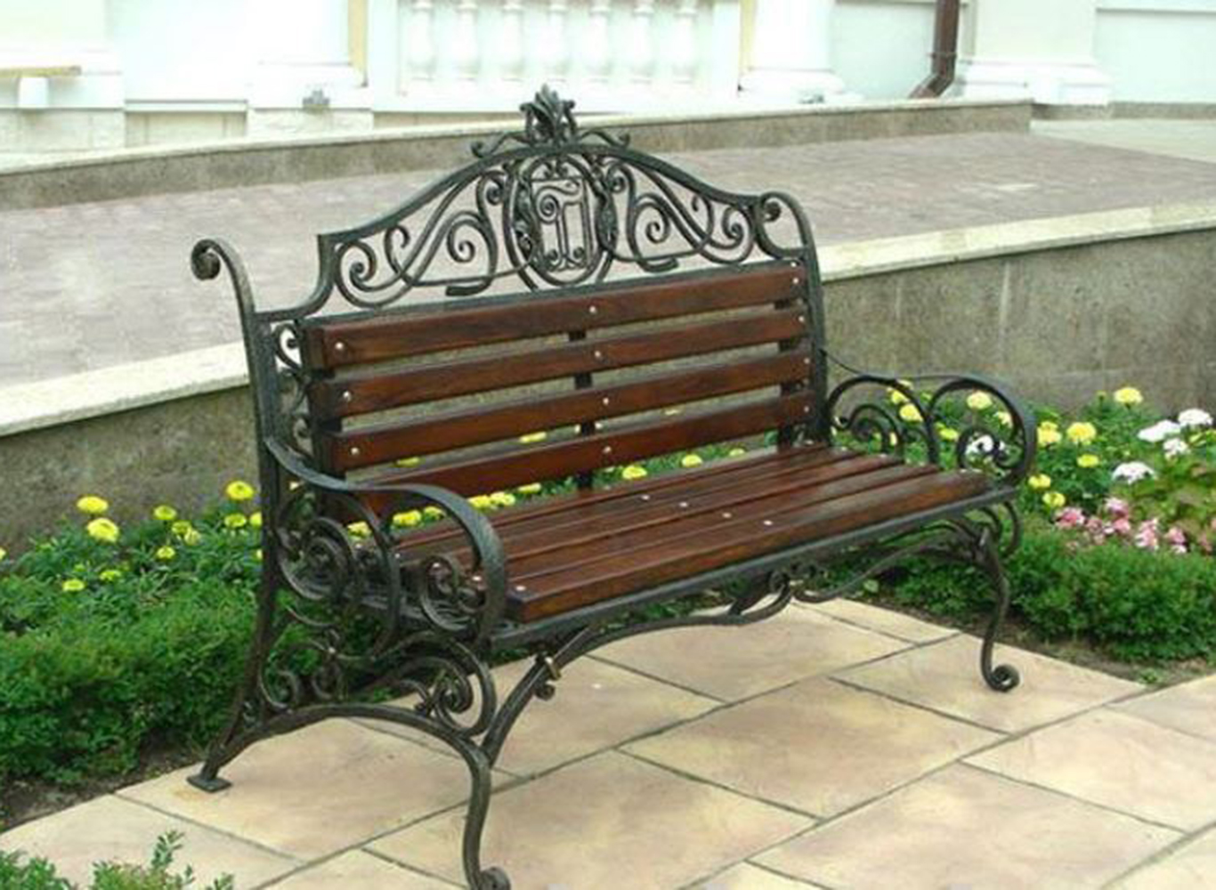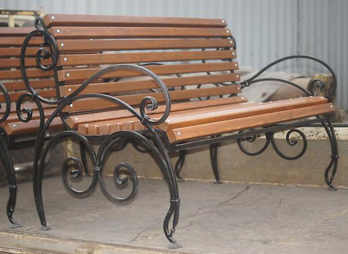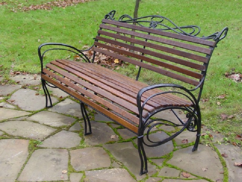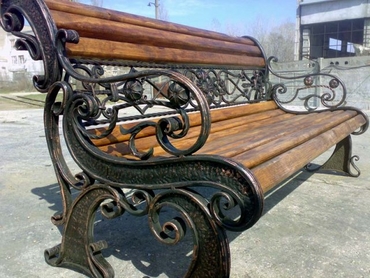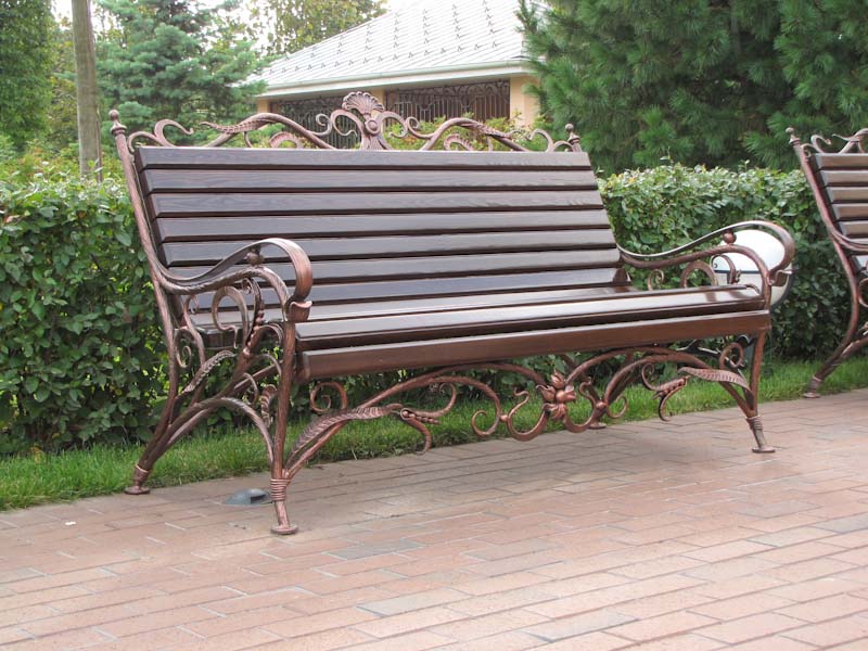Скамья со спинкой и удобными невысокими подлокотниками украшена декоративными коваными элементами. Удобно наклоненная спинка с фигурным изголовьем и сиденье с закругленной кромкой изготовлена с дощатым настилом из крашенного дерева.