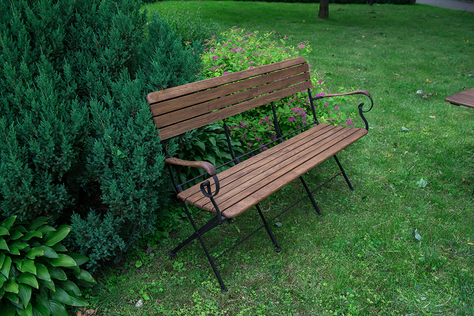 Скамья обладает складным механизмом, что делает ее очень удобной при переносе на другое место и транспортировке. Модель имеет металлический каркас, подлокотники оснащены деревянными накладками.