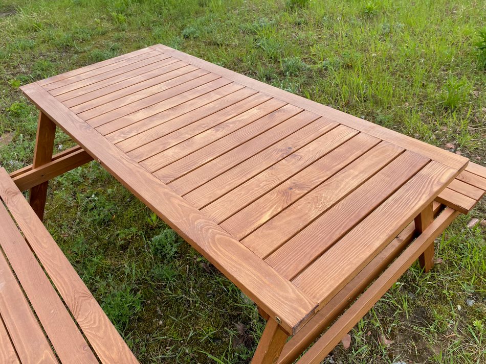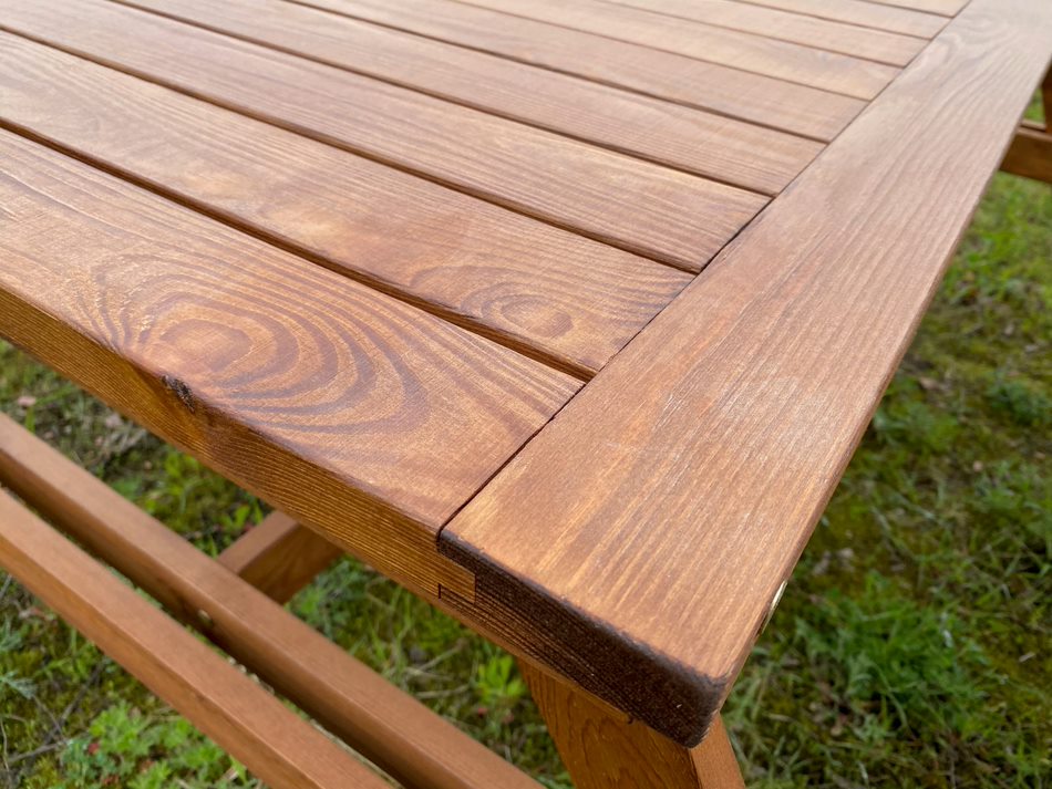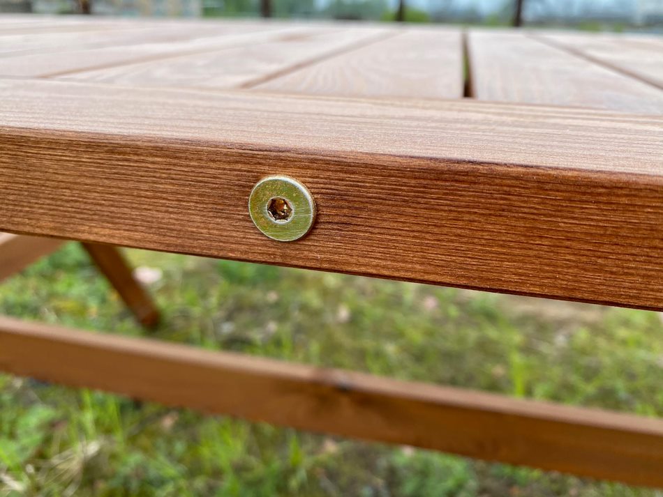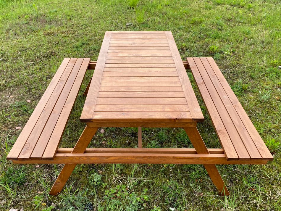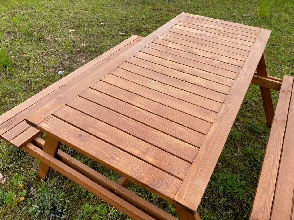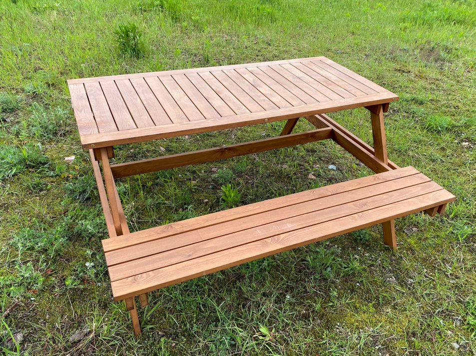 Практичный и удобный садовый гарнитур выполнен из массива сосны. Поверхность деталей покрыта пропиткой и лаком, устойчивым к атмосферным явлениям и предназначенным для эксплуатации на улице. Набор добавит уют и комфорт вашему дому, будет радовать вас и ваших гостей на дачном участке и в загородном доме многие годы. На лавках с комфортом может разместиться до 6 человек, еще от двух до четырех человек можно посадить по торцам стола.