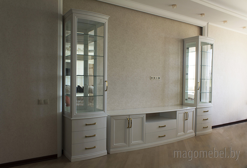 Широкая модель с шуфлядами и полками с распашными дверцами.
