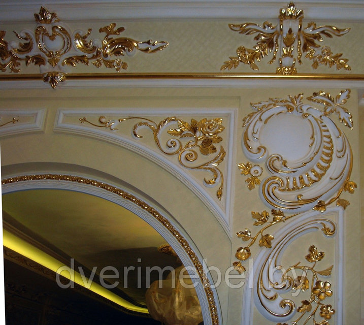 Стильные элементы арки с лепниной инкрустированы позолотой. которая создает атмосферу прошедших эпох. Арка с декорированной лепниной будет особенно интересна любителям и ценителям классического стиля в интерьера. Золочение поталью способно придать интерьеру оттенок изящества и роскоши, сделать пространство более изысканным и нарядным.