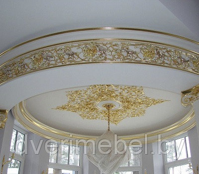 Изысканные элементы лепнины инкрустированы позолотой, которая создает в помещении атмосферу прошедших эпох. Декорированная поталью лепнина будет особенно интересна любителям и ценителям классического стиля в интерьера. Золочение искусственным золотом или сусальное золото способно придать интерьеру оттенок изящества и роскоши, сделать пространство более нарядным.