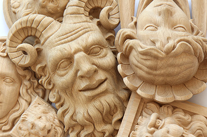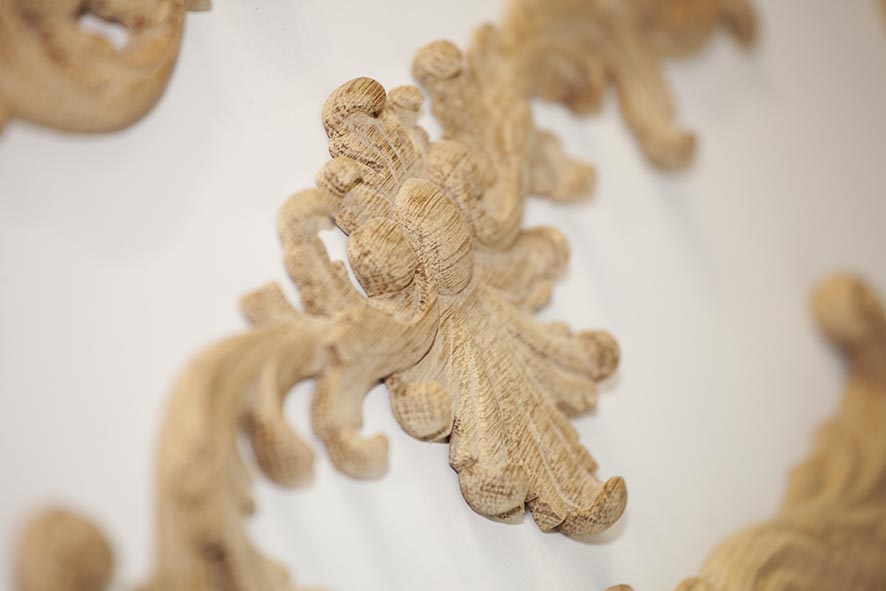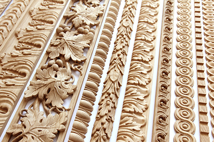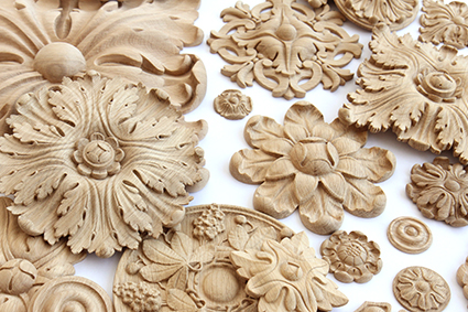 Резной декор изготавливается из натурального дерева: дуба и бука. На выбор заказчика представлено более 1000 вариантов декоративных деревянных элементов. Также отдельным сегментом можно выделить декоративные накладки из полиуретана для ножек столов, стульев и другой мягкой и корпусной мебели.