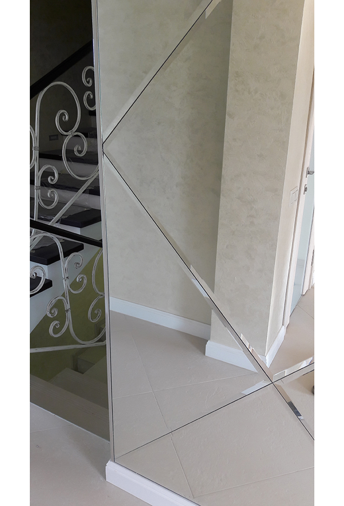 Зеркальные стеновые панели являются прекрасным вариантом для украшения абсолютно любого помещения, так как визуально увеличивают пространство и придают ему неповторимый вид. Панели уложены ромбом и декорированы фацетом, который придает им невероятно элегантный и грациозный внешний вид.