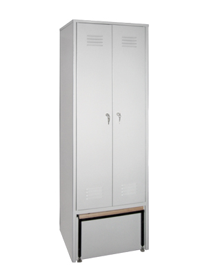 Прочный двухдверный одежный шкаф оборудован выдвижной скамейкой, полкой для головных уборов, штангой для вешалок и металлическими крючками для одежды. Каждое отделение шкафа запирается на замок «Euro-Locks» повышенной секретности. Скамья крепится на прочные металлические опоры.