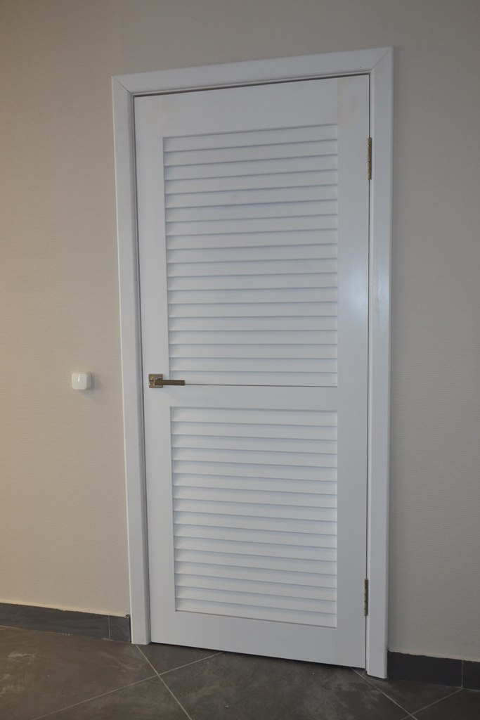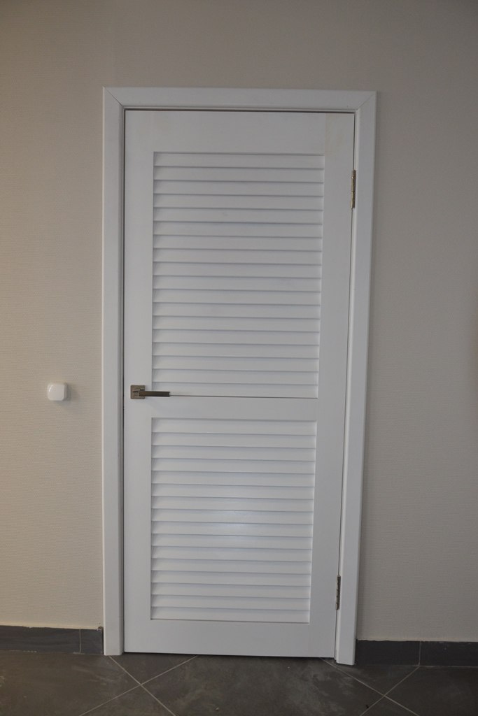 Дверь из массива дерева с неподвижными жалюзи. Эмалирована в белый цвет. Подойдет для чулана или гардеробной комнаты.