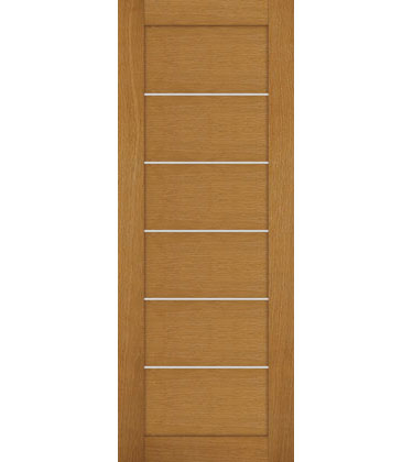 Дверь декорирована горизонтальными полосками, что увеличивает помещение, в котором она находится.