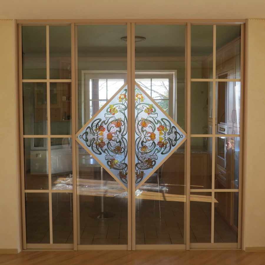 Данная модель раздвижной двери выполнена из стекла. В центральной части модели выделяется красочный витраж в матовом стеклянном ромбе. Модель не только визуально разделит пространство двух комнат, но и украсит одновременно обе из них.