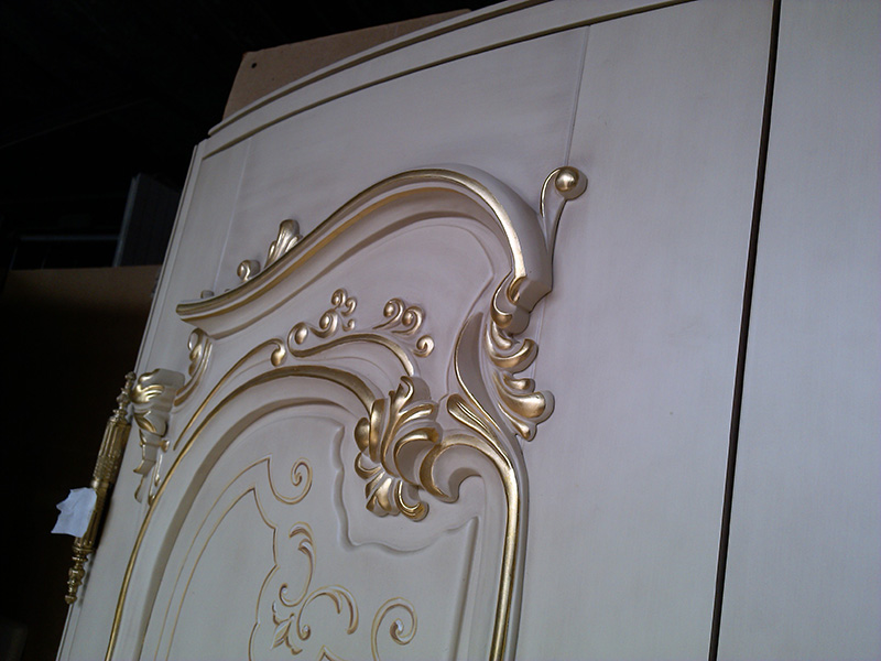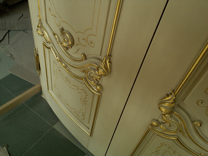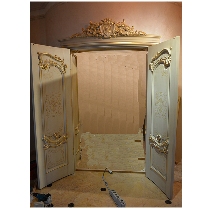 Межкомнатная двустворчатая дверь выполнена в невероятно величественном и элегантном классическом стиле. Дверное полотно декорировано фигурными филенчатыми вставками и резными элементами. Также модель дополнена большой и изящной капителью. Цвел двери выбран слоновой кости с золотой патиной.
