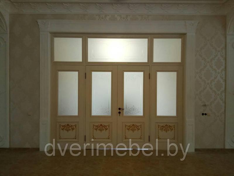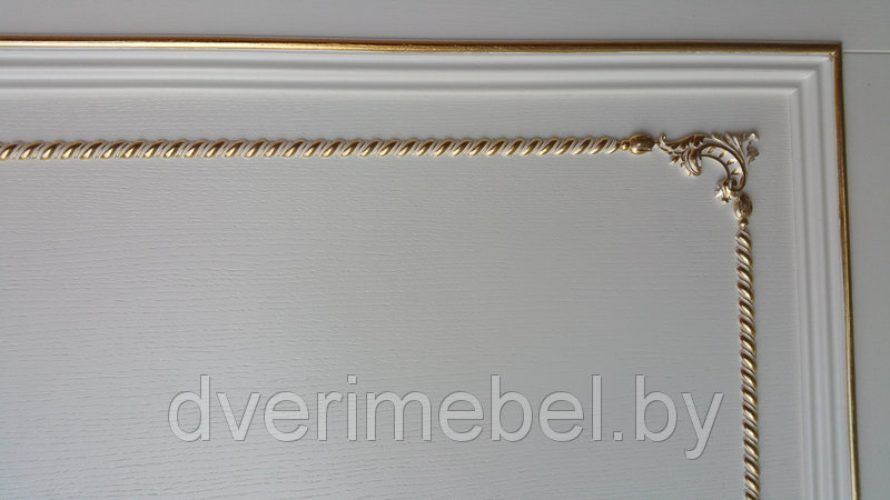 Стильная инкрустация. В декорировании габаритной межкомнатной двери была использована поталь, известная также как искусственное золото. Белый цвет двери отлично отражает красоту позолоченных элементов, делает их более заметными. Остекленная дверь создает в комнате интересную, более атмосферу. Прочная конструкция двери позволяет защитить помещение от посторонних звуков.