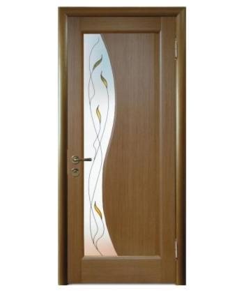 Каркас двери изготовлен из отборной древесины с прослойкой HDF и облицован так же, как филенки и коробка натуральным модифицированным шпоном, изготовленным по технологии «fine-line». Полотно межкомнатной двери Стройдетали «Руссо» ДО декорировано необычной и элегантной вставкой из ударопрочного стекла с цветочным рисунком. Модель выполнена в цвете орех под древесину.