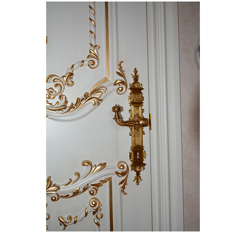 Глухая межкомнатная дверь изготовлена качественного и долговечного сращенного массива дерева, который имеет хорошие показатели к сопротивлению деформации и растрескиванию. Дверное полотно выполнено в белом цвете и декорировано фигурными филенками и резными элементами, окрашенными золотым цветом. Также модель дополнена элегантной цитаделью и грациозными колоннами.