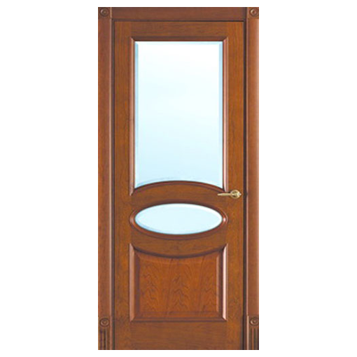 Дверь в классическом стиле. Декор модели стоит на трех "китах": два остекленных элемента и филенка. Стекло дополнительно украшено фигурной фрезеровкой.