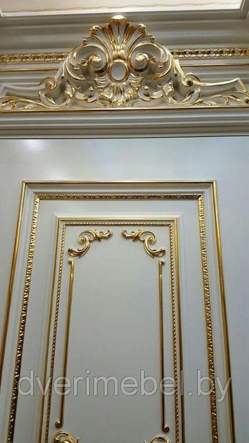 В декорировании межкомнатной двери была использована поталь,также известная как искусственное золото. Белый цвет модели отлично отражает красоту позолоченных элементов и капители, делает их более заметными. Дверь глухая, без остекленных створок. Такая конструкция позволяет не допускать колебаний температуры и более надежно защищает помещение от посторонних звуков.
