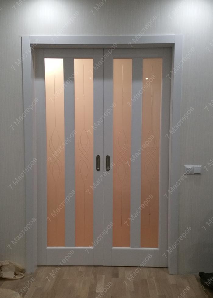 код 85331Раздвижные или распашные межкомнатные двери светлого оттенка со вставками стекла и декоративным рисунком.
