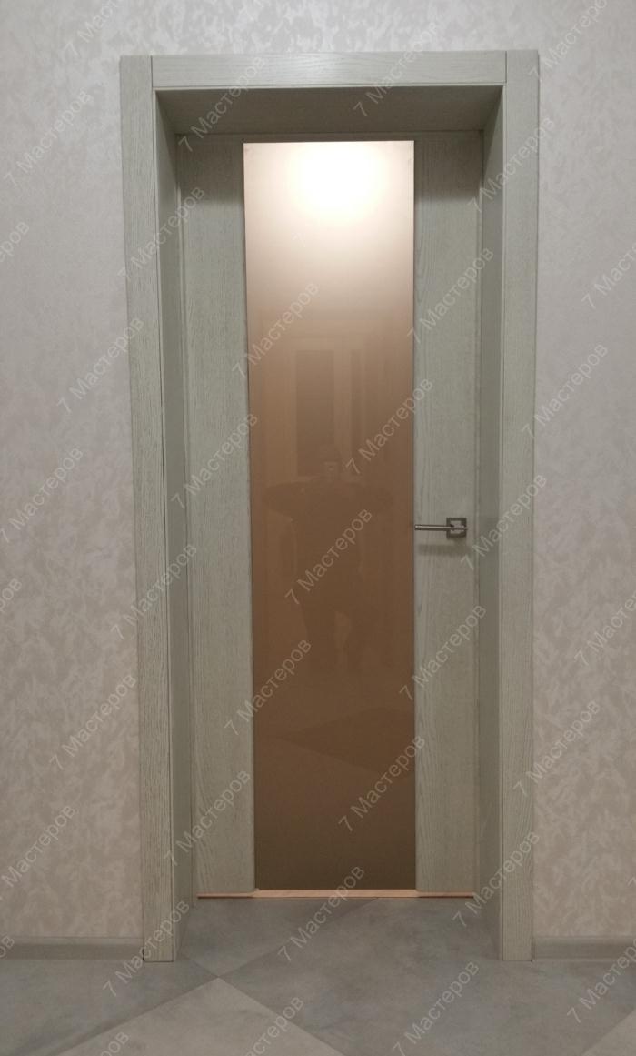 Вариант фасада для стильной межкомнатной двери можно подобрать под интерьер конкретной комнаты. Можно выбрать как створку с матовым стеклом, так и изысканную зеркальную створку, в зависимости от Вашего желания и дизайна интерьера. Остекление или зеркало будут занимать большую часть двери, оставляя небольшие полосы для основного материала.