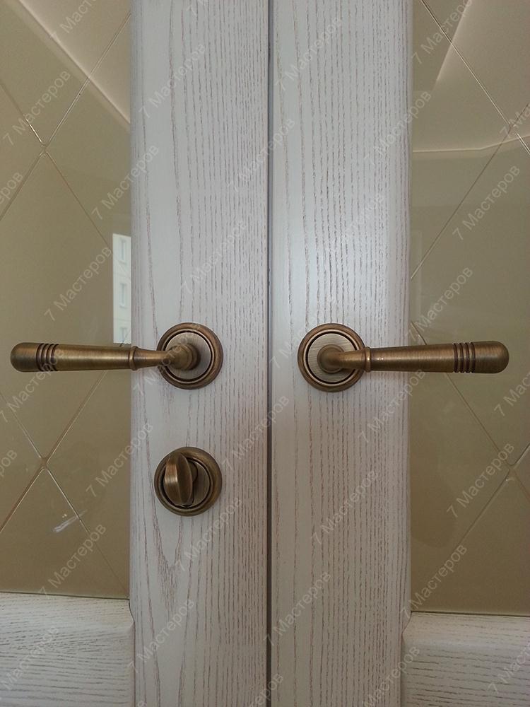 Стильные межкомнатные двери из массива ясеня помогут придать дизайну комнаты законченности. Дверь окрашена в цвет светлого ясеня с применением фрезеровки в нижней части фасада. Створки остеклены фацетным стеклом с ромбовидной инкрустацией.
