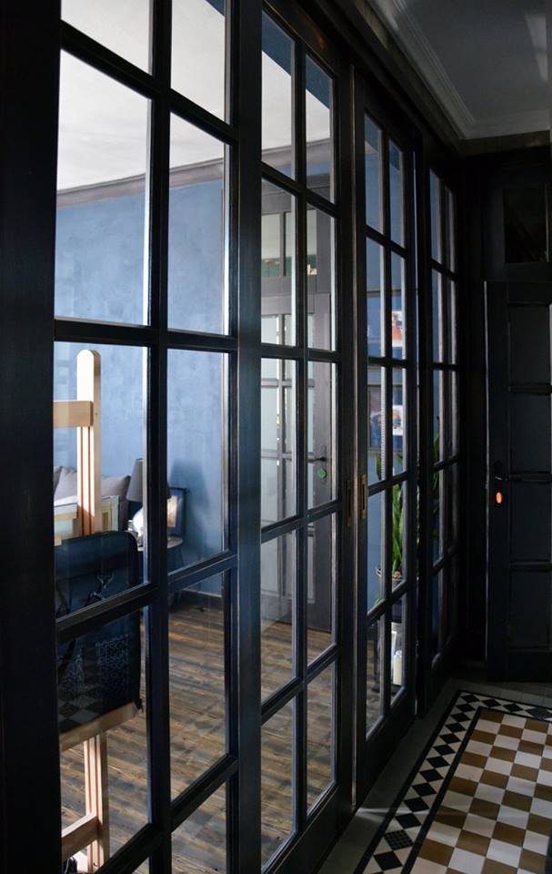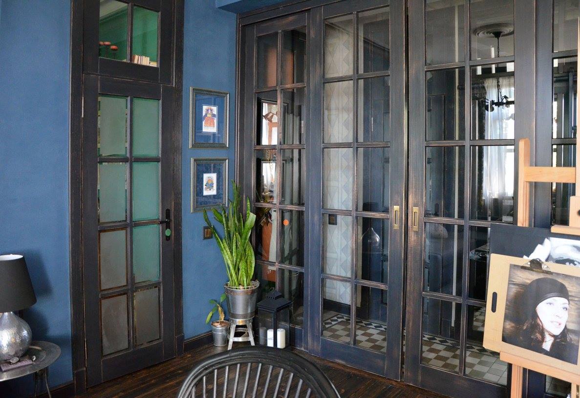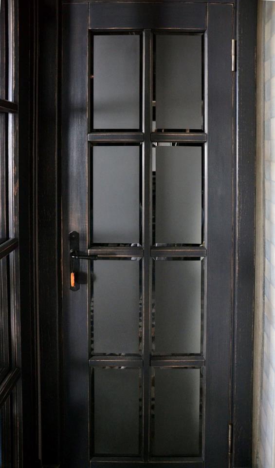 Двери-купе. Профиль черного цвета, белое тонированное стекло.