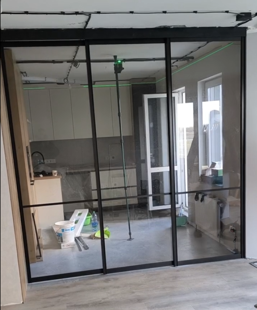 Надежный раздвижной механизм, черный металлический профиль, прозрачное стекло.