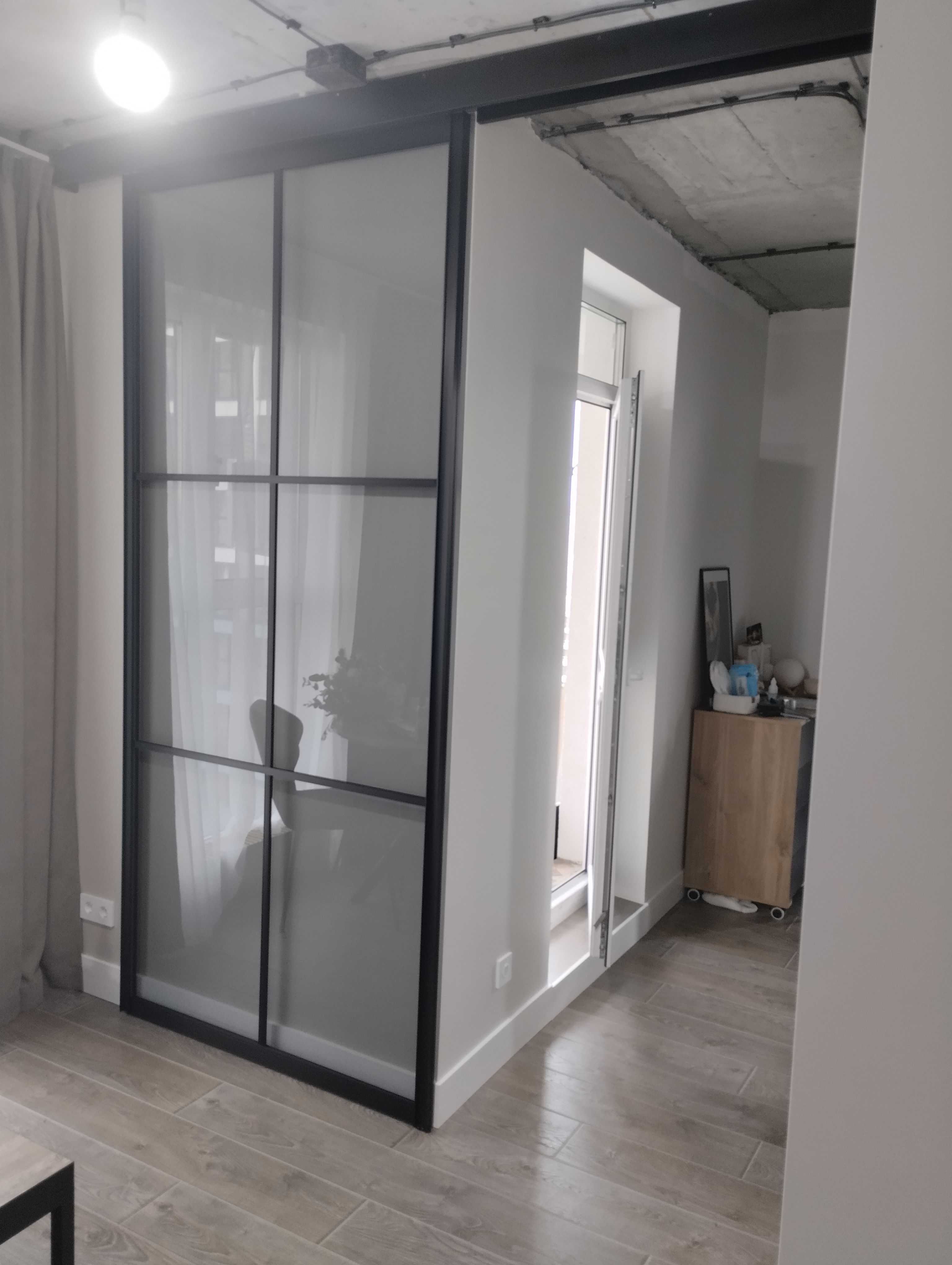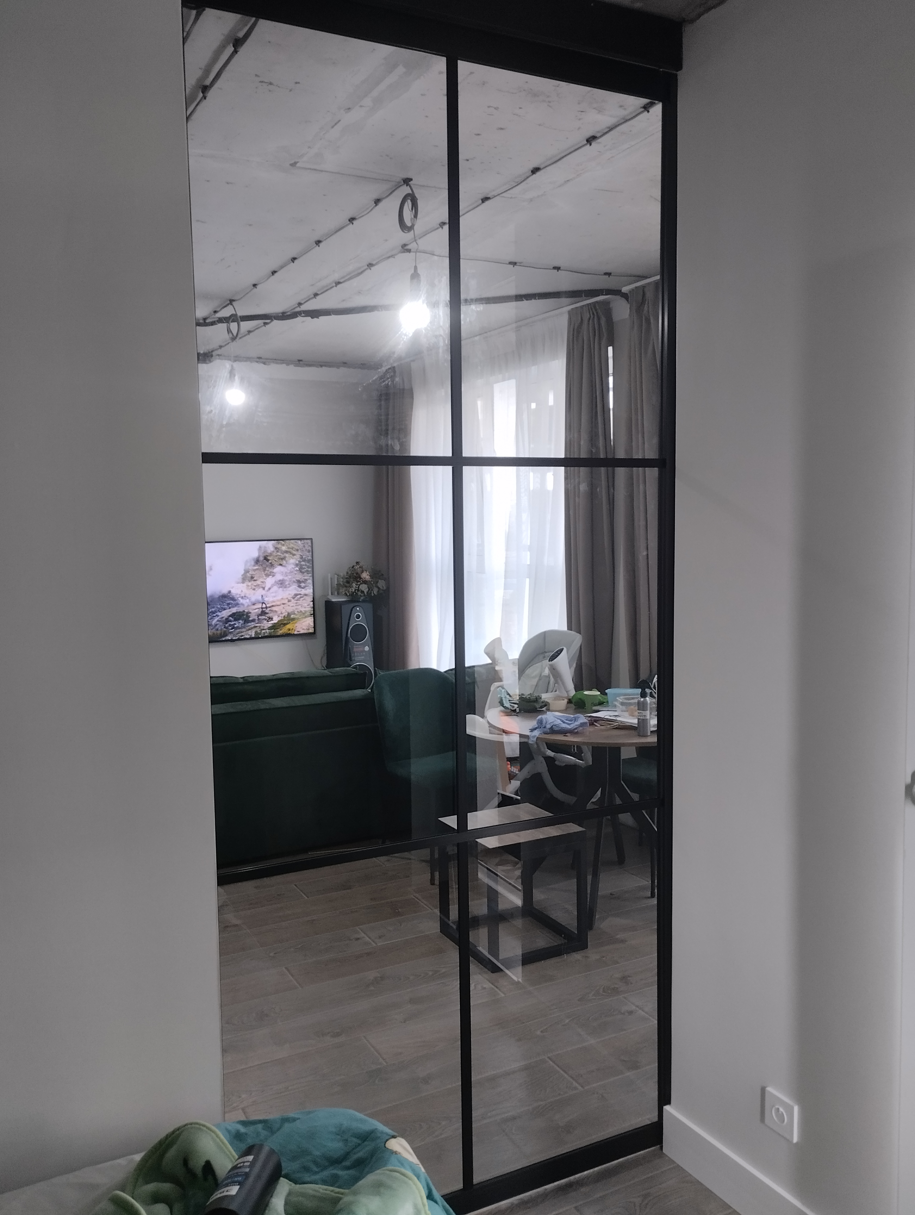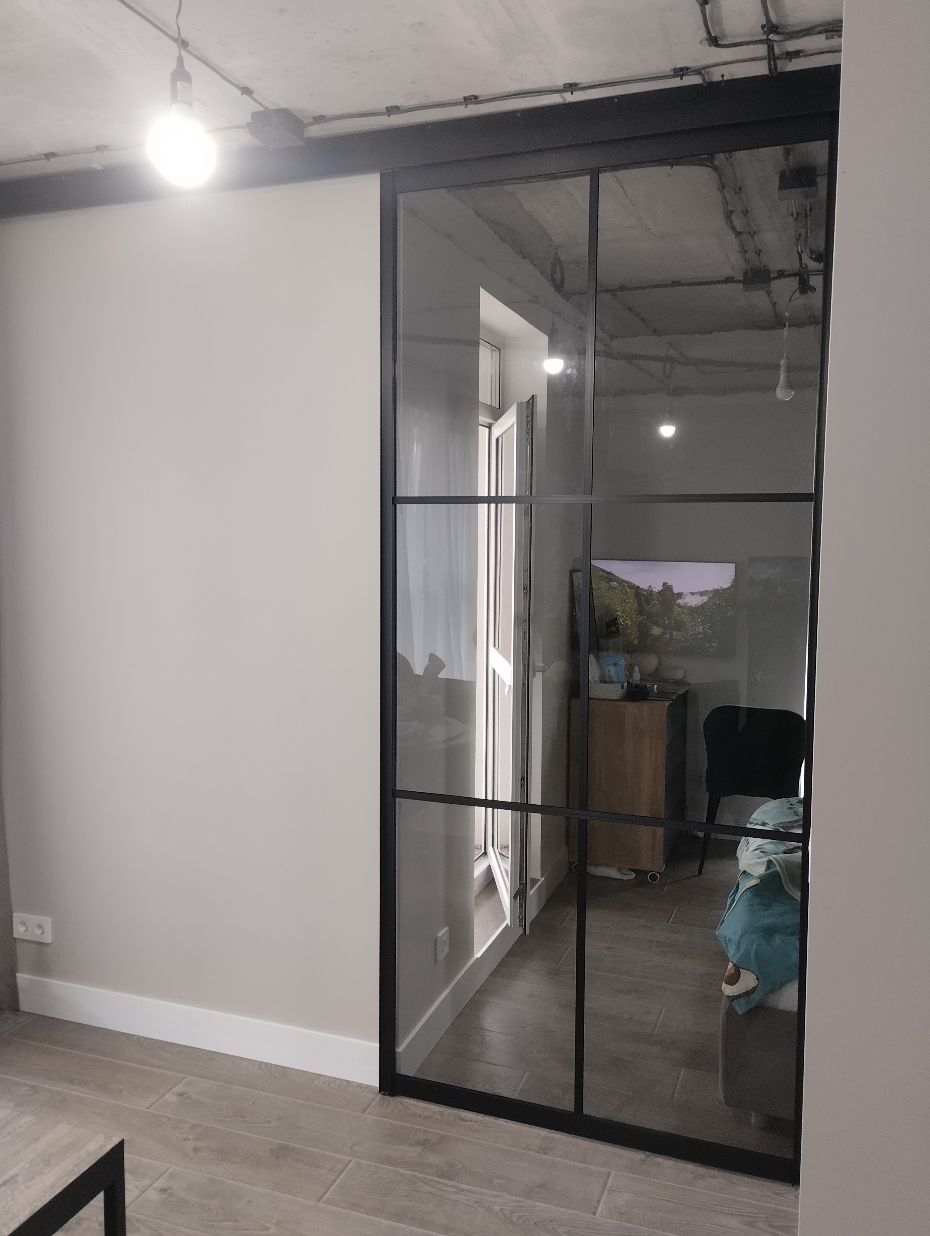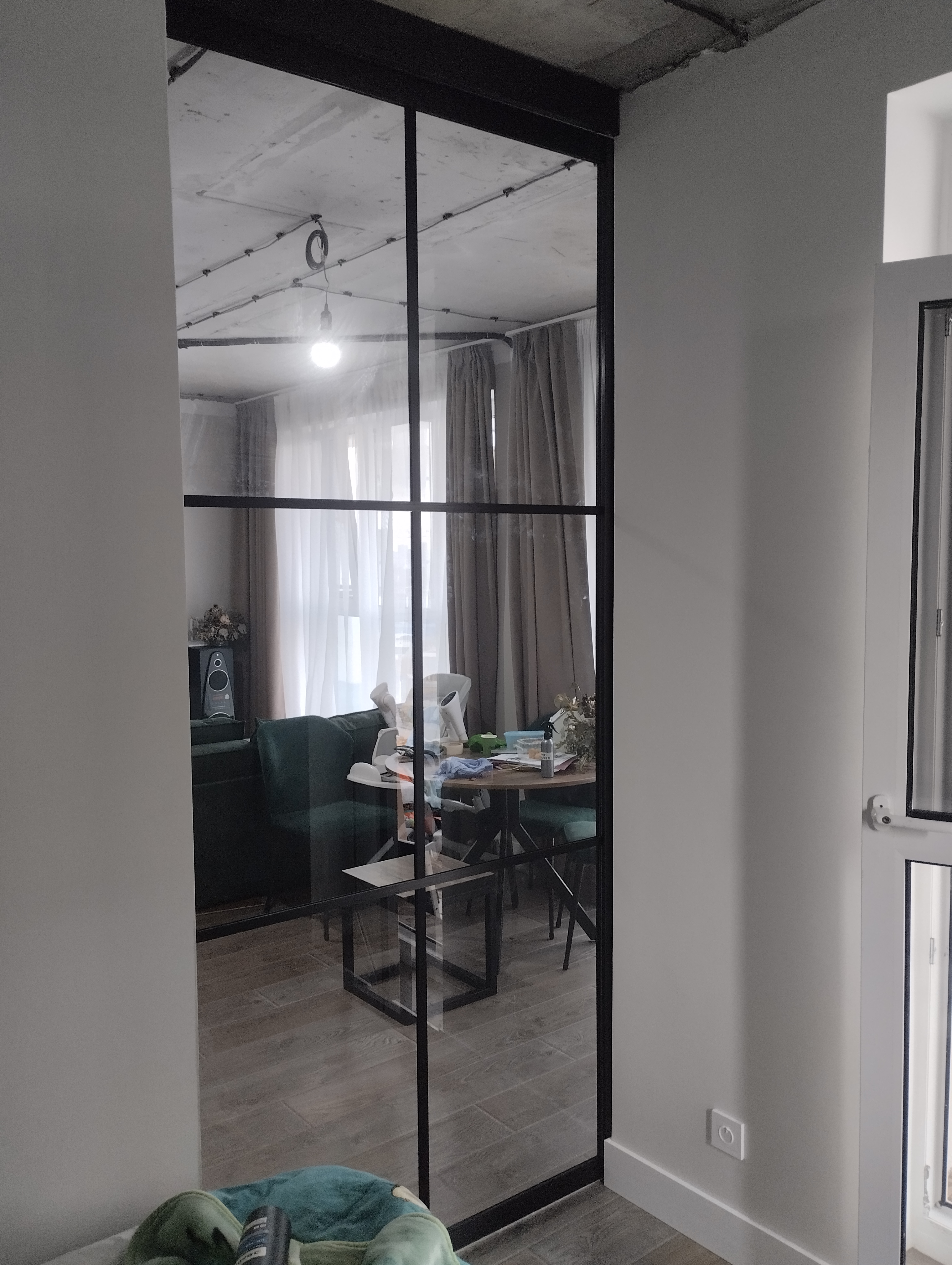 Большая перегородка для зонирования. Черный металлический профиль, прозрачное стекло.
