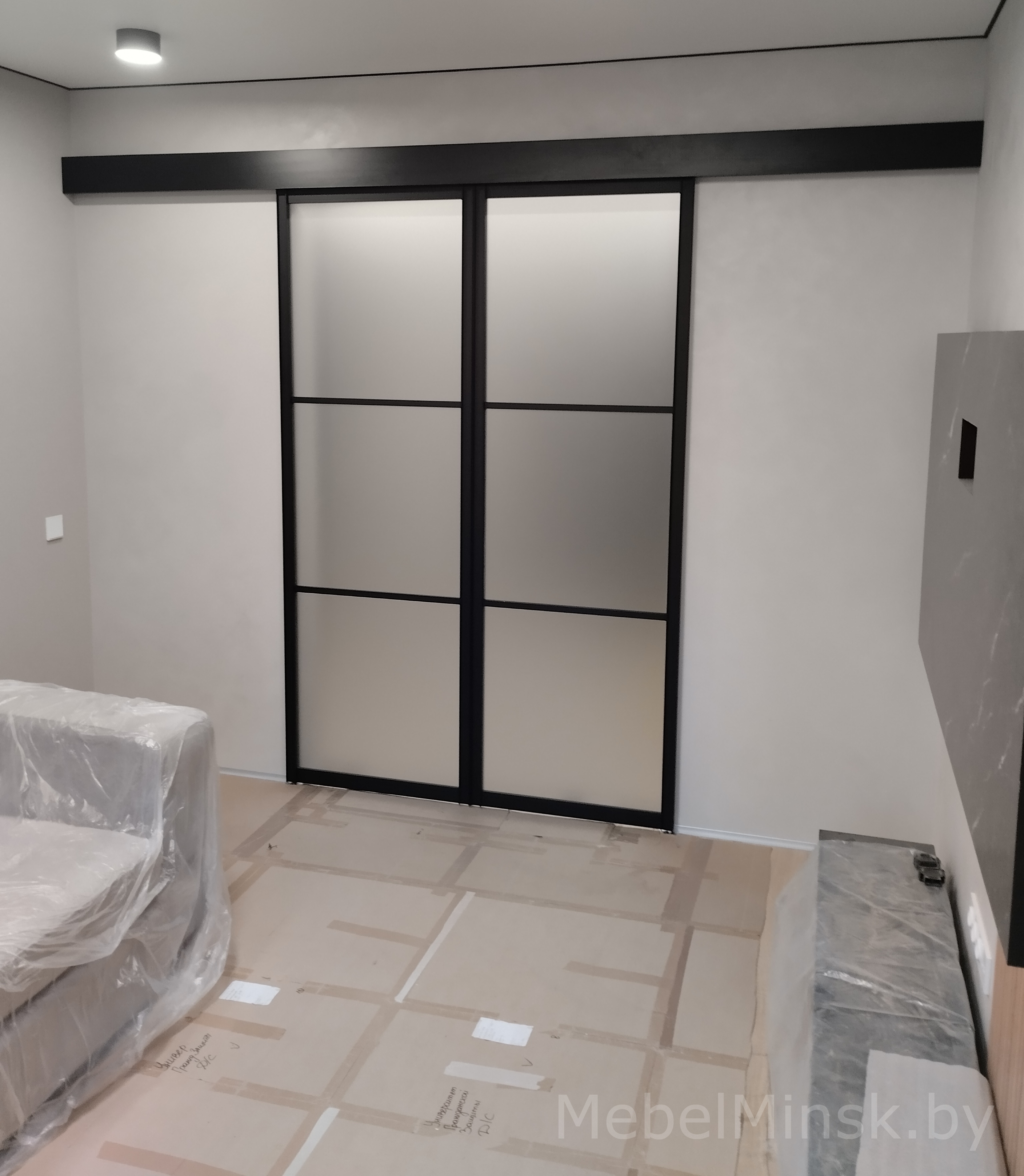 Широкая раздвижная дверь-перегородка из алюминия и стекла