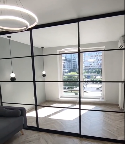 Подойдет для зонирования пространства в гостиной, спальне, гардеробной или даже кухни. Перегородка представляет собой полотно из профиля, который может быть наполнен стеклом, пластиком, акрилом или их комбинациями. Раздвижной механизм позволяет перемещать створки вдоль направляющих в одну или обе стороны.