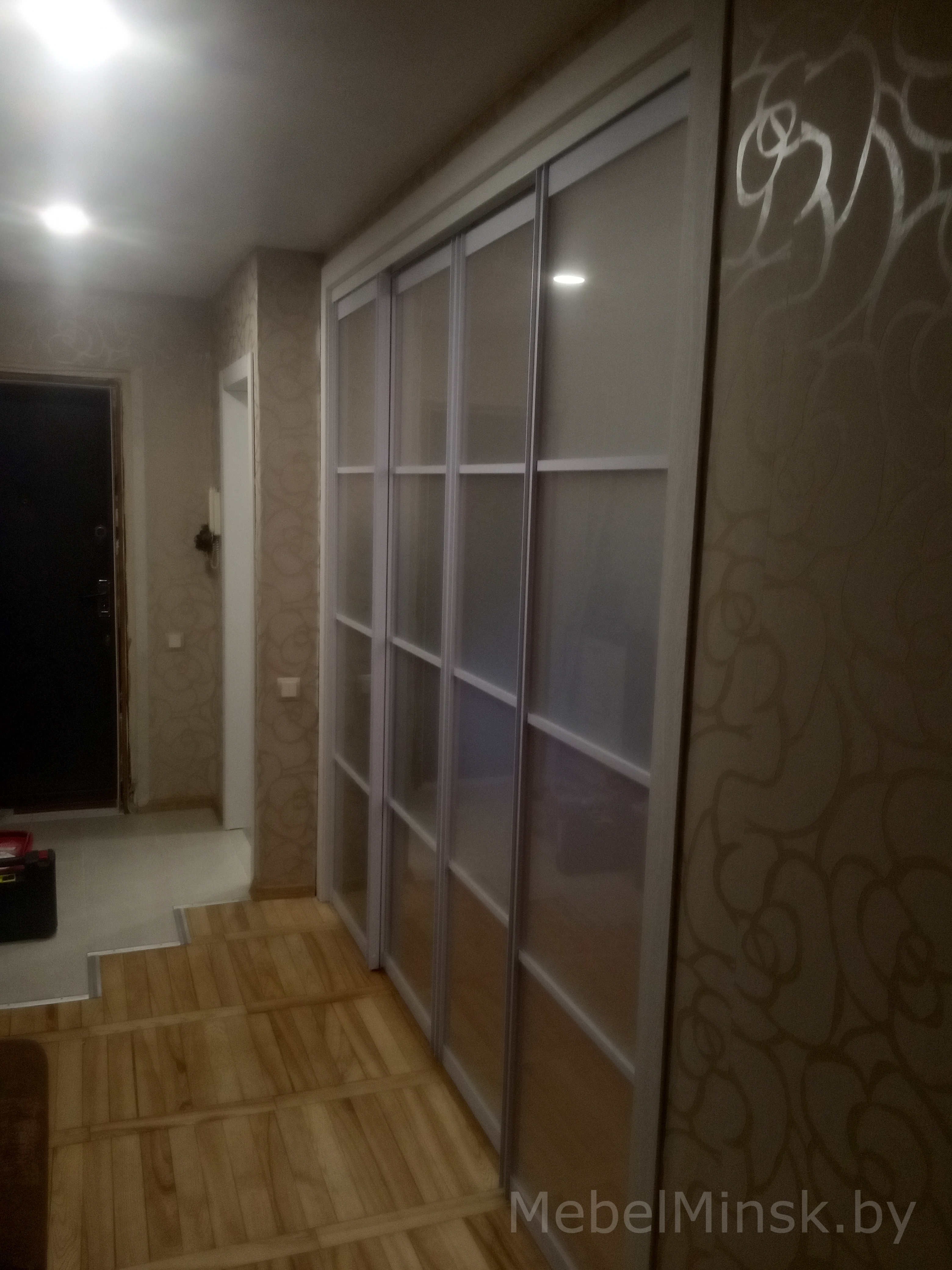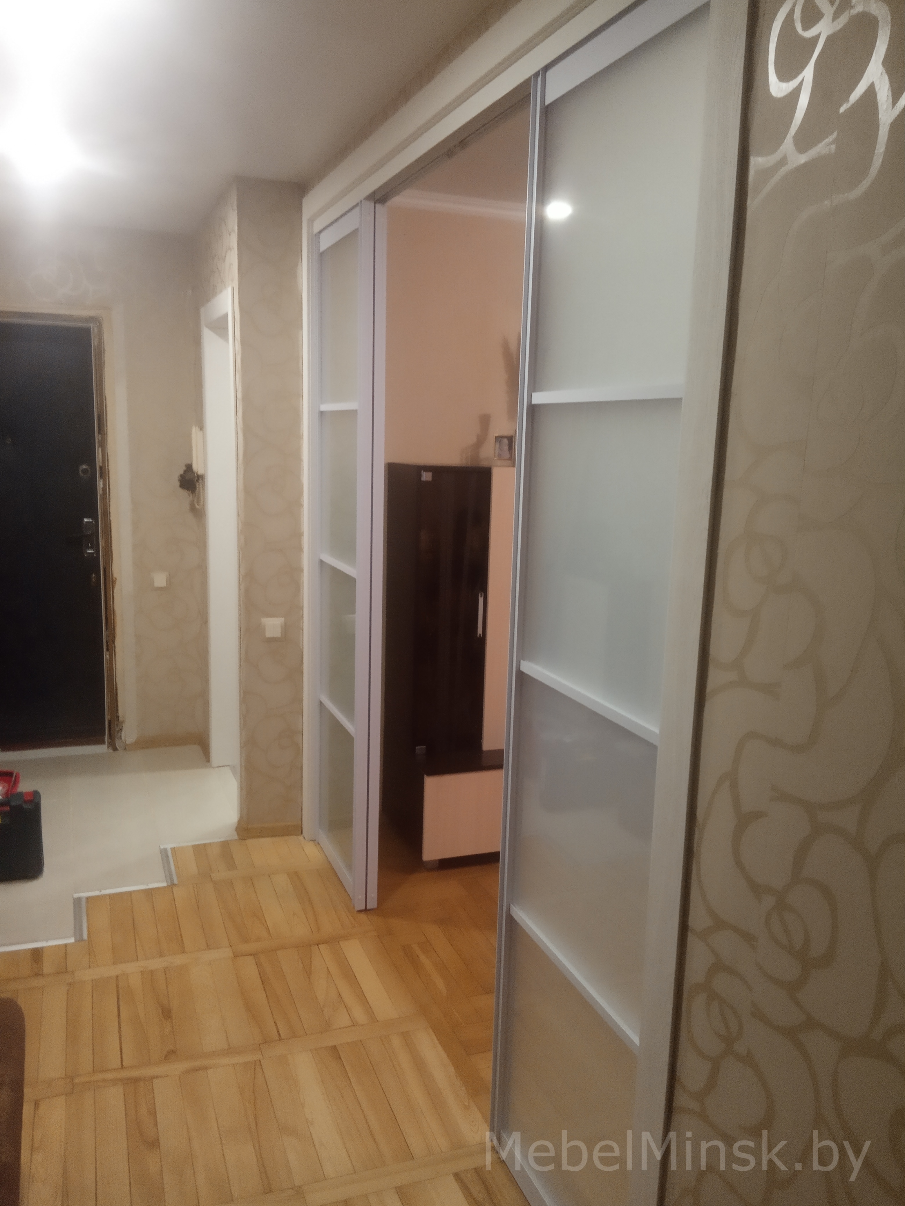Белая раздвижная дверь перегородка с матовым стеклом