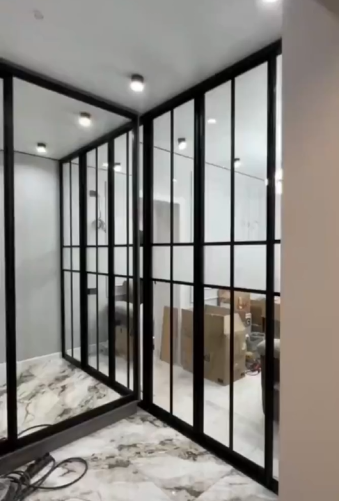 Большая межкомнатная дверь. Черный металлический профиль, прозрачное стекло.