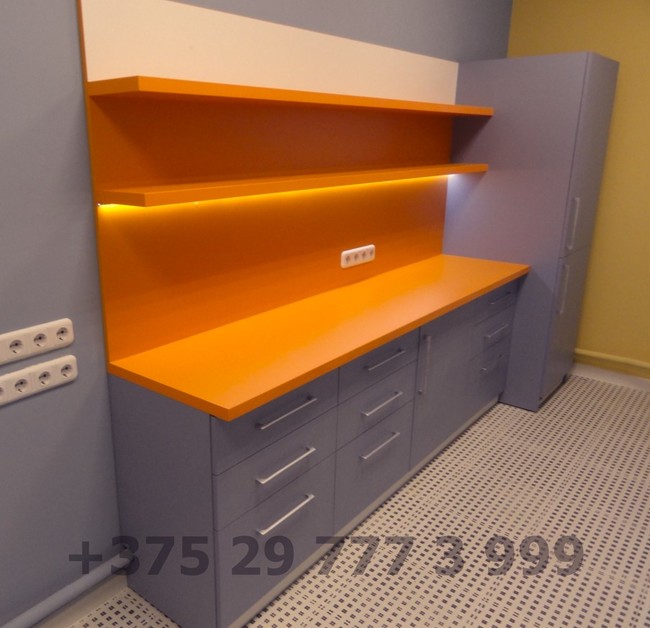 Постформинг EGGER, фасады верхних ящиков — стекло лакобель в алюминиевом профиле.