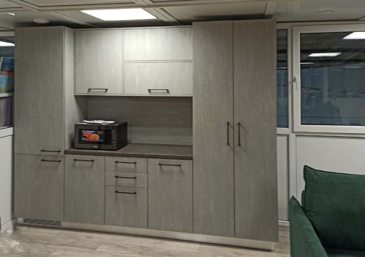 Постформинг EGGER, фасады верхних ящиков — стекло лакобель в алюминиевом профиле.