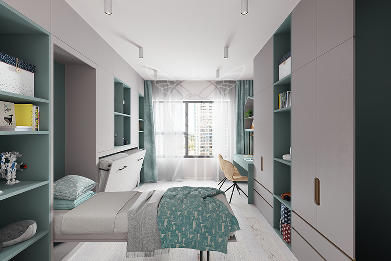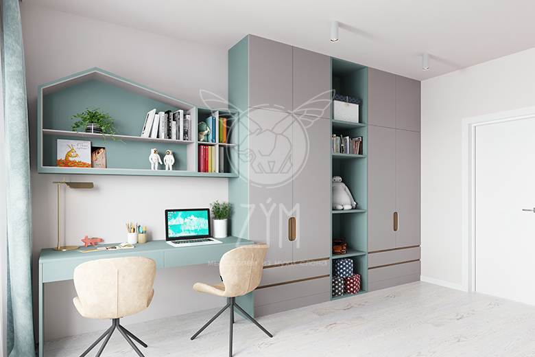 Детская для двоих детей из ЛДСП Egger. Включает кровать-трансформер с мягким изголовьем, кровать в нише, шкаф, оnкрытые полки и рабочее место.
