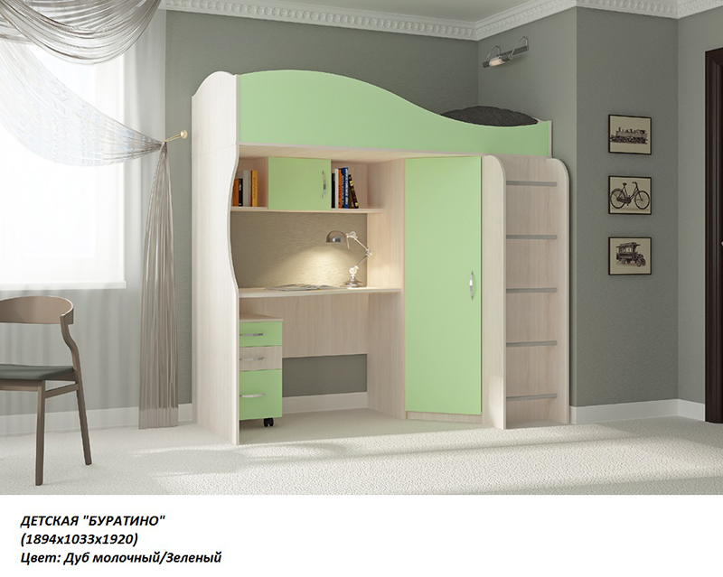 Мебель для детской «Буратино» изготовлена из качественных и экологичных материалов с использованием надежной фурнитуры. Верхний ярус представляет собой комфортное спальное место, под которым расположена рабочая зона, представленная письменным столом с тумбочкой и небольшим шкафом.На выбор предлагается несколько вариантов цветовых решений мебели.
