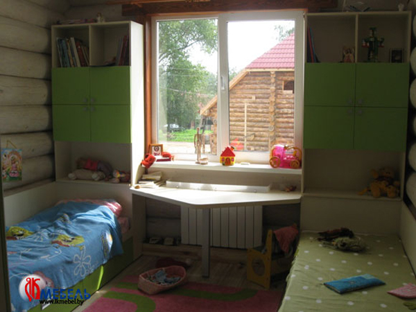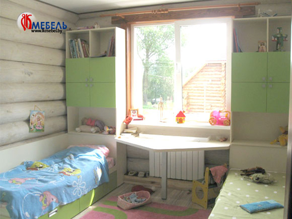 Кровати-тахты, угловая рабочая зона, тумбы с ящиками, навесные полки.