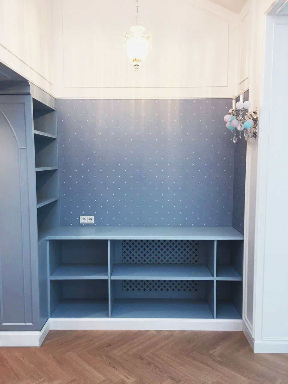 Тумба в детскую с мягким сиденьем и декоративными полками.