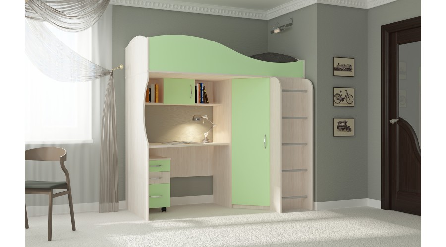 Детская Буратино Кровать-чердак зелёный. Габариты 1892(Ш) х 985(Г) х 1920(В) мм. Материал ЛДСП. Цвет дуб мол./зеленый. Кромка ПВХ. Сборка на одну сторону (как на фото). Спальное место под матрас 800 х 1860 мм.