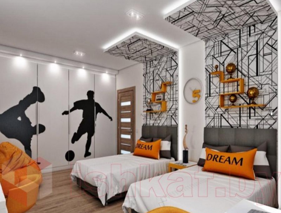 код 111035В число мебели входят две односпальные кровати, встроенный шкаф-купе, прикроватные тумбочки и письменный стол с креслом.