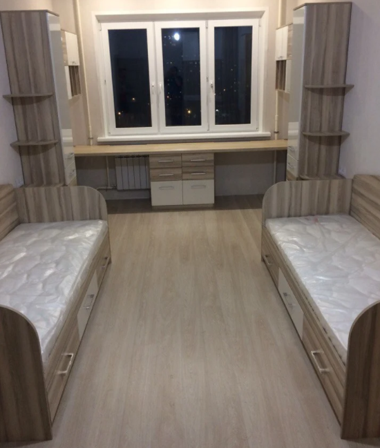 Кровати-тахты, угловая рабочая зона, тумбы с ящиками, навесные полки.