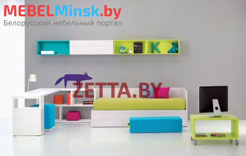 Комплект корпусной мебели для одноместной детской комнаты изготовлен в белоснежном цвете, в частности кровать с пристенным бортиком и рабочий стол, переходящий в угловой напольный стеллаж. Полая тумба на колесиках и модули навесной полки дополнительно окрашены в оливковый и лазурный оттенки.